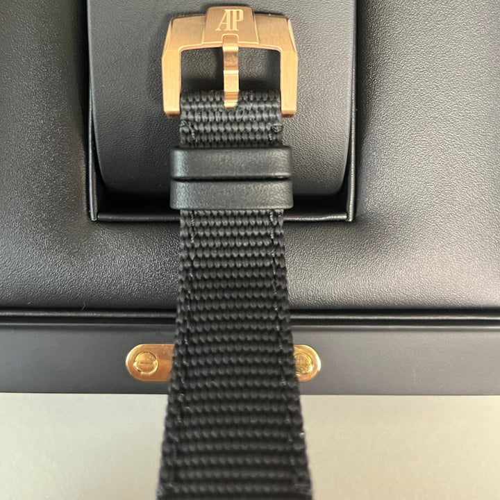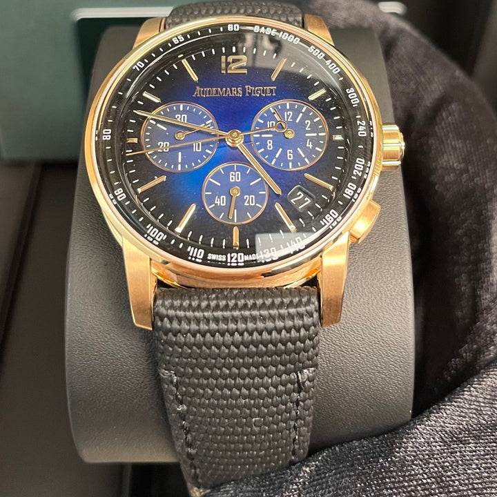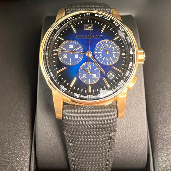 26393OR.OO.A002KB.03 Audemars Piguet. This Men’s watch has 41 mm Brushed & polished 18K Rose gold case. Lacquered smoked blue dial. 18K Rose gold hour markers and hands. Black textile strap. Dial Type: Analog. Date display between 4 and 5 o’clock position. Chronograph – three sub-dials displaying: 60 second located at 6 o’clock movement, 30 minute located at 9 o’clock movement and 12 hours at 3 o’clock movement. Audemars Piguet Calibre 4401 Automatic movement, containing 40 Jewels, composed of 367 parts, bitting at 28800 vph, and has a power reserve of approximately 70 hours. Water resistance up to 30m./ 100 ft.