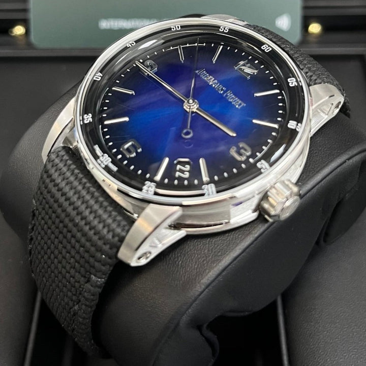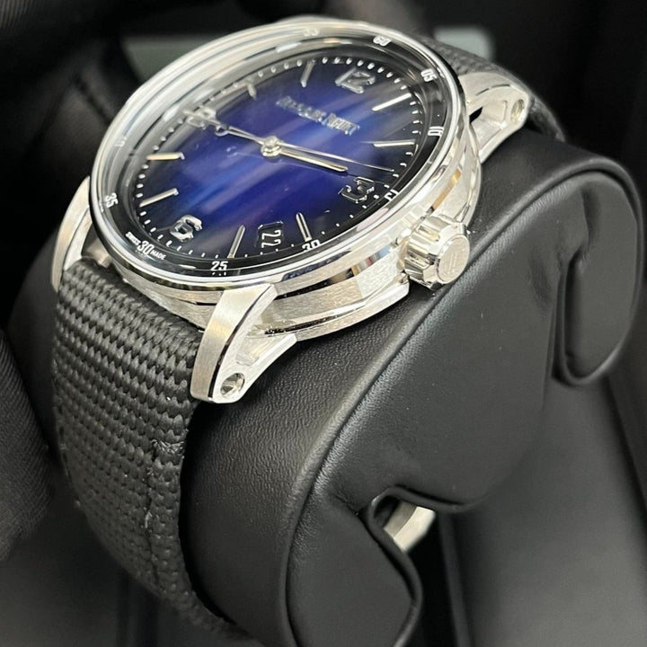 Smoked blue lacquered dial with sunray pattern base, white gold applied hour-markers and hands, black lacquered inner bezel.