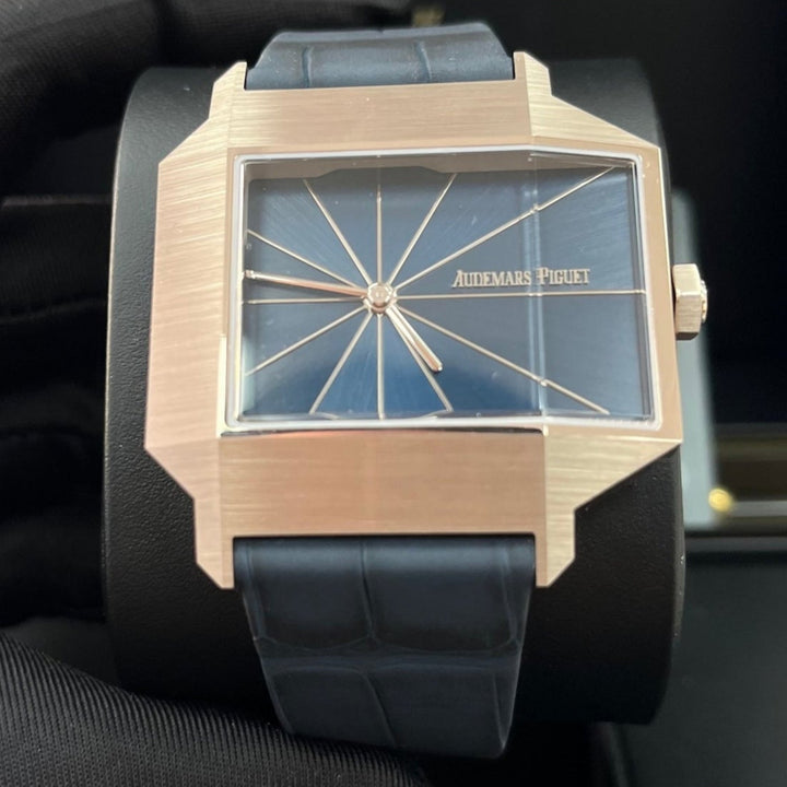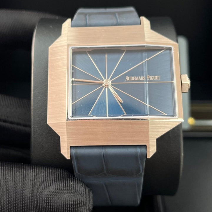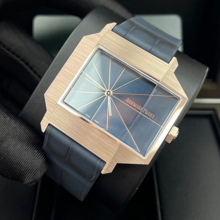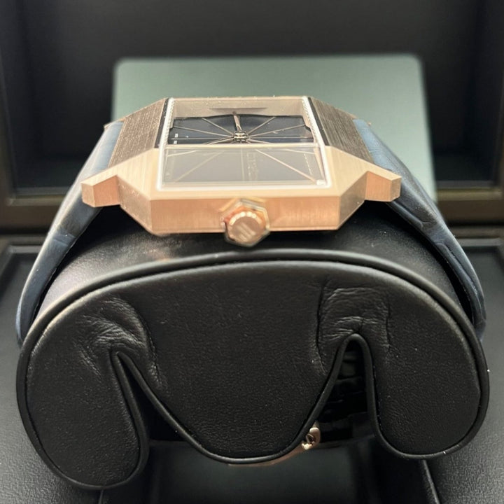 A tribute to a timepiece from 1960, this limited edition features an asymmetrical case crafted in sand gold, a new 18-carat gold alloy that comes to life in the light. It is enhanced by a parted blue dial with a unique brushing finish. 18-carat sand gold case, glareproofed sapphire crystal and caseback. Parted blue dial with parallel brush effect, sand gold hands. Blue contrasted alligator strap, 18-carat sand gold pin buckle.