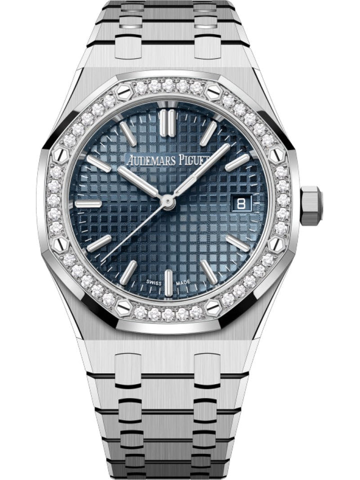 The 34 mm stainless steel selfwinding model is embellished by a "Bleu Nuit, Nuage 50" "Grande Tapisserie" dial encircled by a diamond-set bezel. The piece also features the latest Royal Oak design evolution. Stainless steel case, bezel set with brilliant-cut diamonds, glareproofed sapphire crystal and caseback. “Bleu nuit nuage 50” dial with “Grande Tapisserie” pattern, white gold applied hour-markers and Royal Oak hands with luminescent coating. Stainless steel bracelet with AP folding clasp.