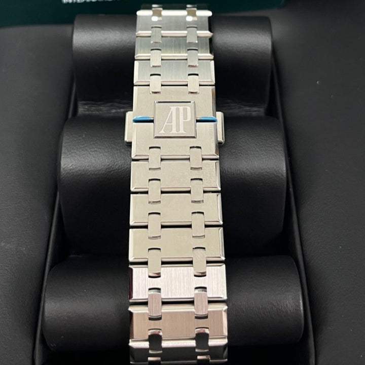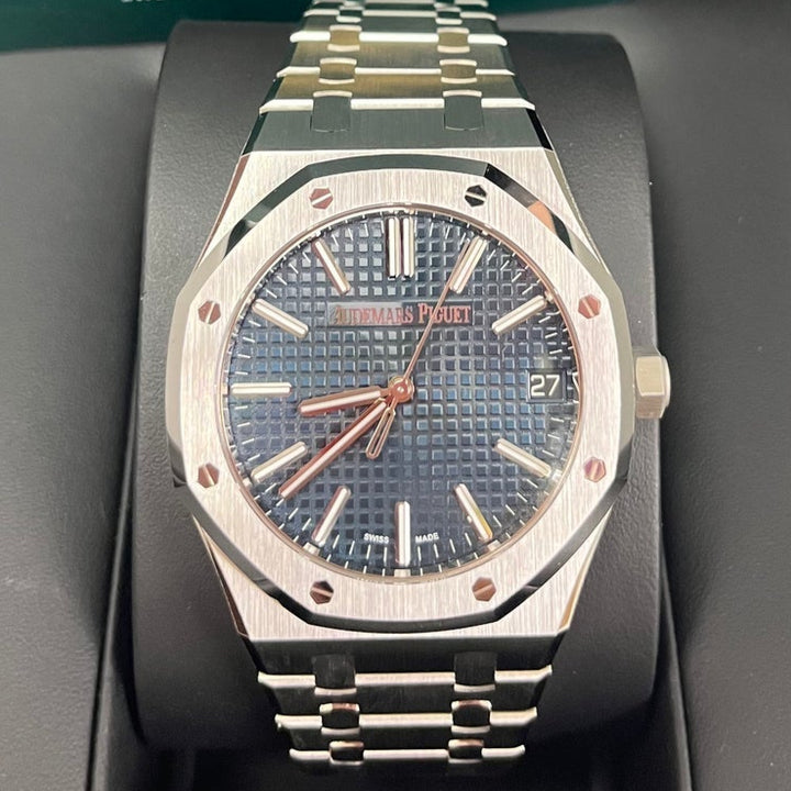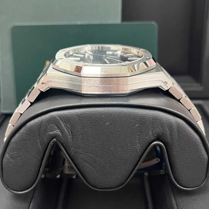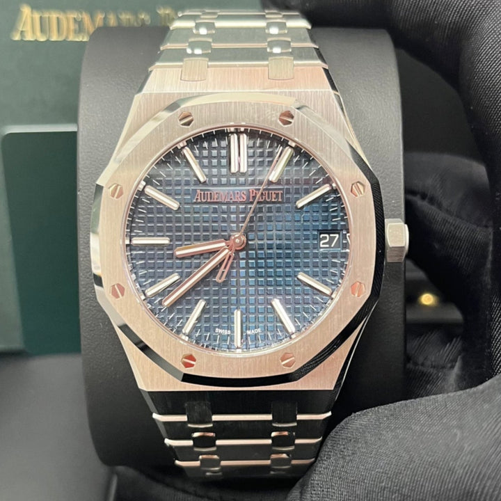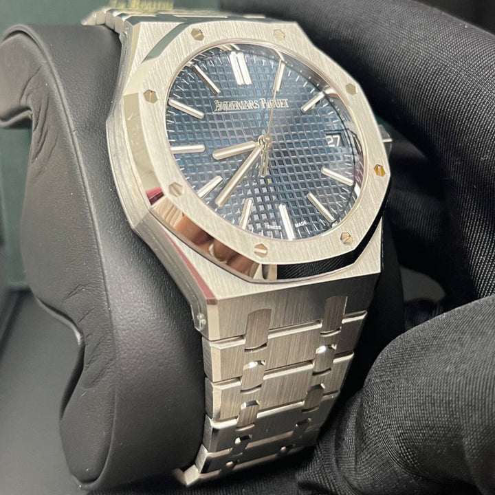 The Audemars Piguet Royal Oak 15510ST in 41mm stainless steel is a modern masterpiece, featuring the iconic "Bleu Nuit, Nuage 50" dial with its legendary Grande Tapisserie pattern. A direct evolution of the original Royal Oak from 1972, this selfwinding model combines bold aesthetics with technical excellence. The finely brushed stainless steel case and integrated bracelet offer both durability and elegance, while the luminescent-coated white gold hour markers ensure legibility in any setting. A true collector's piece, this AP Royal Oak 15510ST is the ultimate blend of heritage and contemporary luxury.