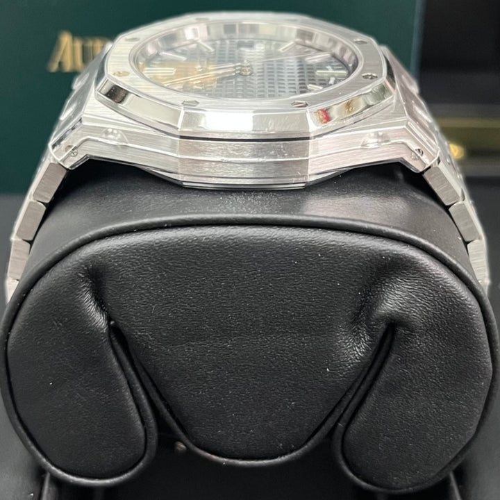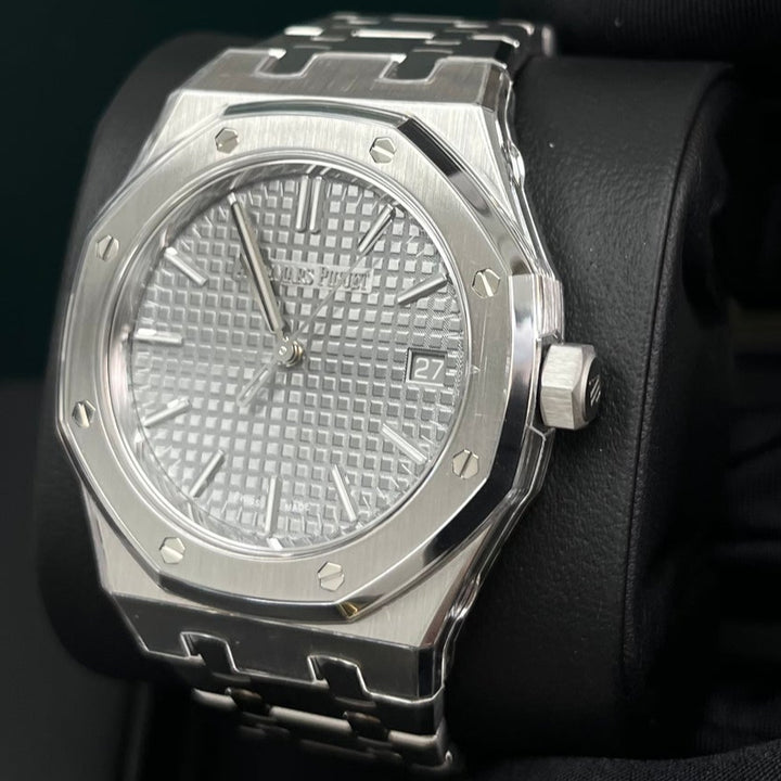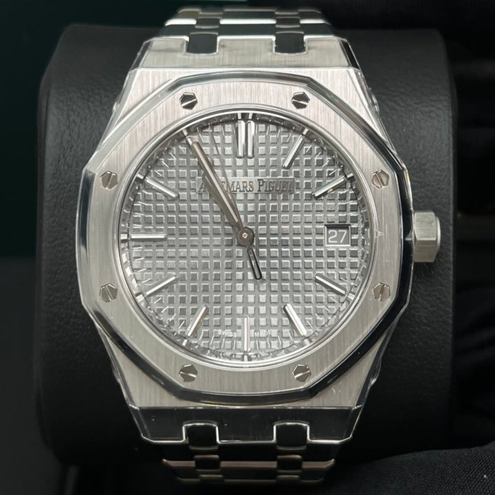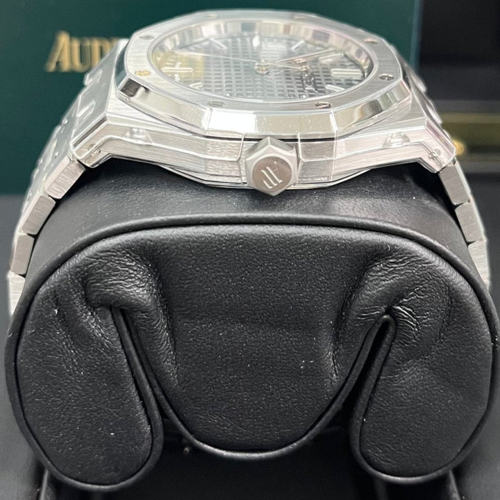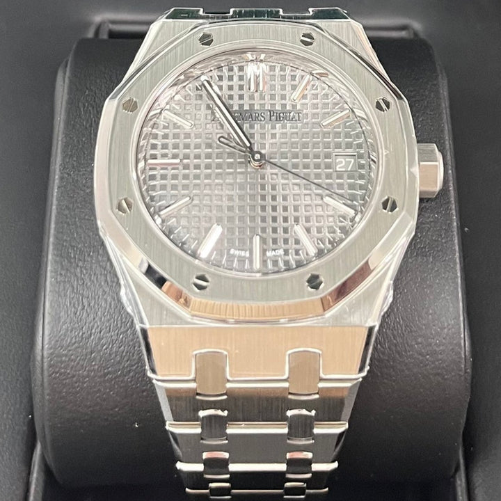 Audemars Piguet Royal Oak Selfwinding (ref 15550ST.OO.1356ST.03) features an automatic movement; gray tapisserie dial; sapphire-crystal, transparent case back; and 37 mm, stainless steel case on a stainless steel strap with a stainless steel folding clasp.