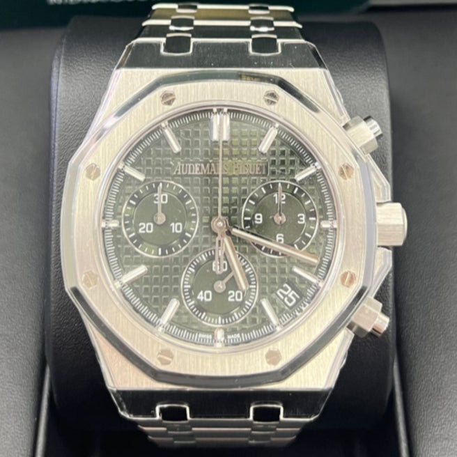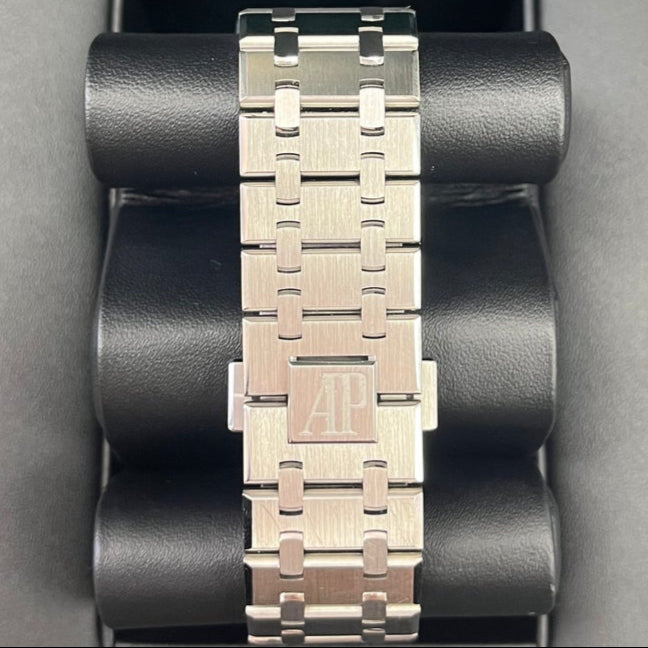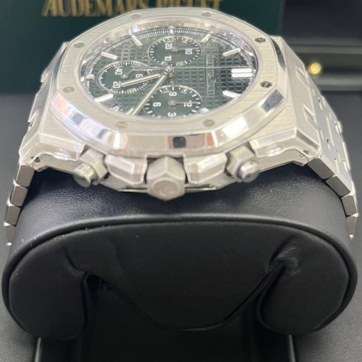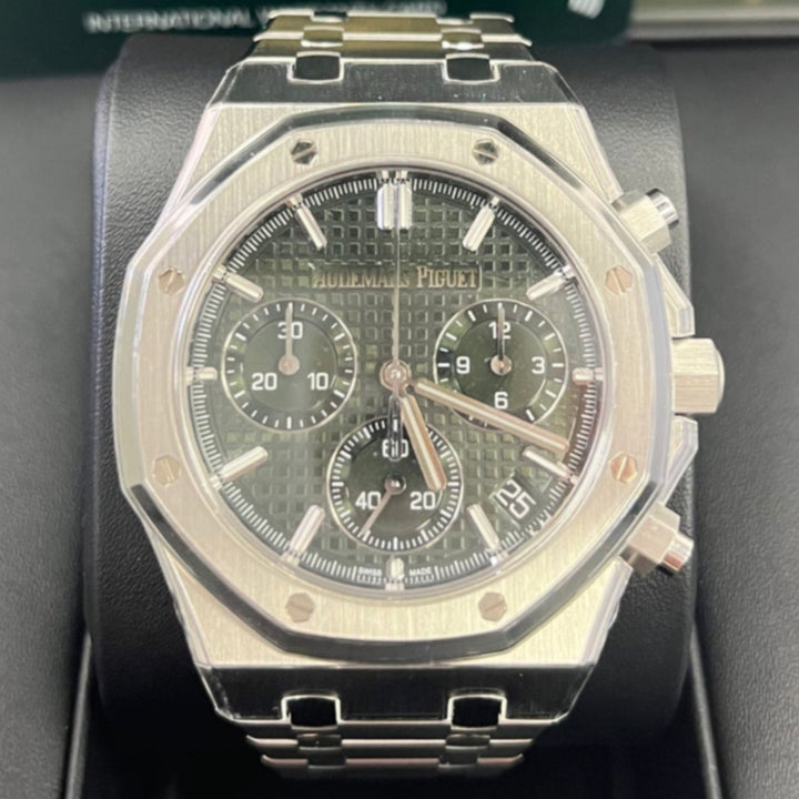 This 41 mm Selfwinding Chronograph, which benefits from the latest Royal Oak design evolution, marries stainless steel with a khaki “Grande Tapisserie” dial. Stainless steel case, glareproofed sapphire crystal and caseback, screw-locked crown. Khaki green dial with “Grande Tapisserie” pattern, khaki green counters, white gold applied hour-markers and Royal Oak hands with luminescent coating. Stainless steel bracelet with AP folding clasp.