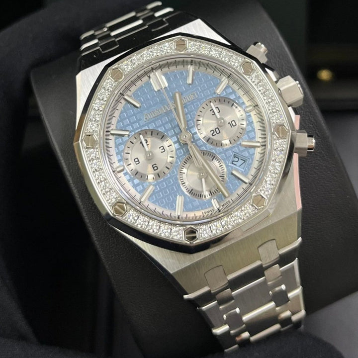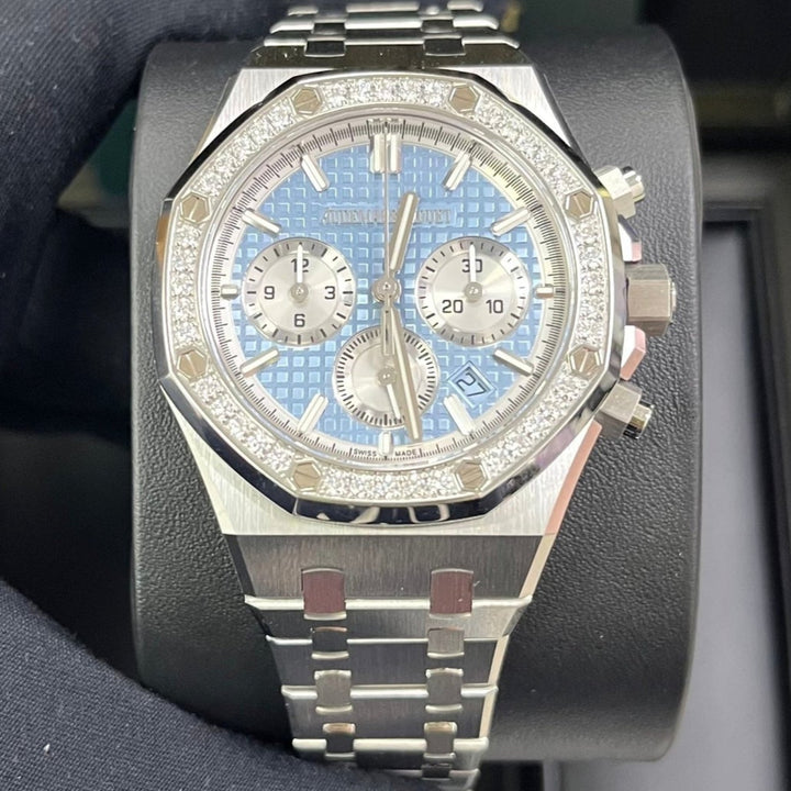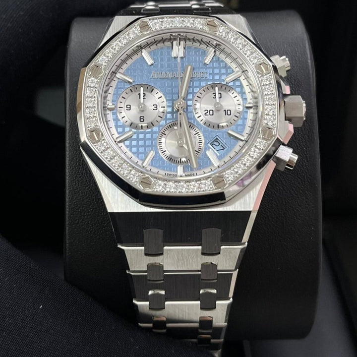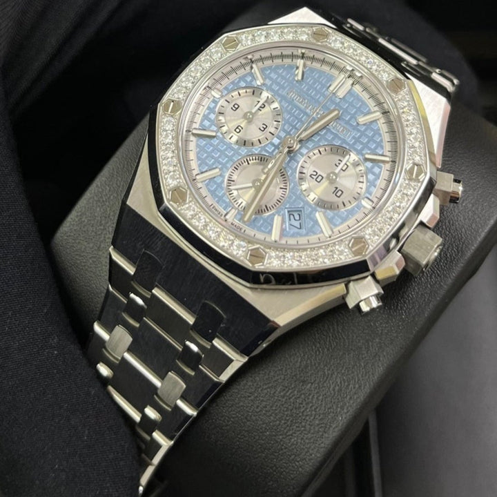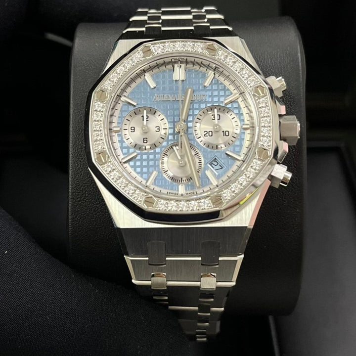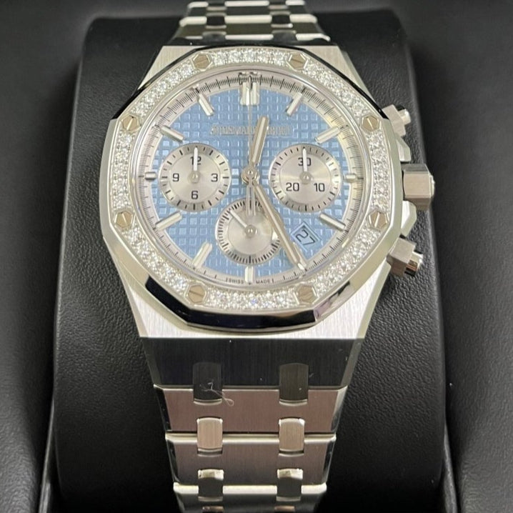 This 38 mm Chronograph elegantly marries stainless steel with a light blue “Grande Tapisserie” dial enhanced with a diamond-set bezel and silver-toned counters. The new Royal Oak design evolution confers the watch a slenderer aesthetic. Stainless steel case, bezel set with brilliant-cut diamonds, glareproofed sapphire crystal, screw-locked crown. Light blue dial with “Grande Tapisserie” pattern, silver-toned counters, white gold applied hour-markers and Royal Oak hands with luminescent coating. Stainless steel bracelet with AP folding clasp.