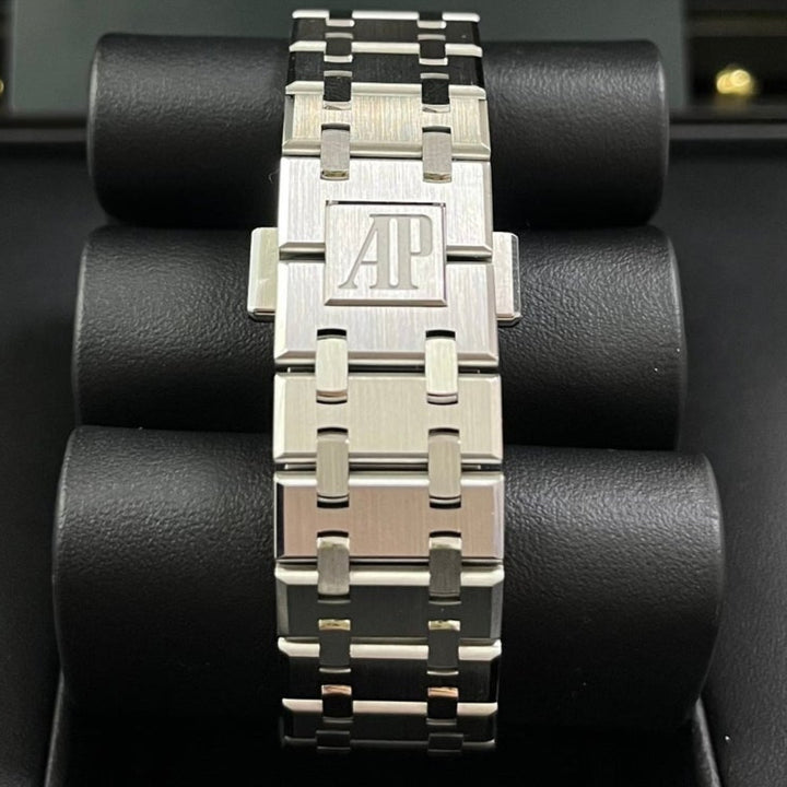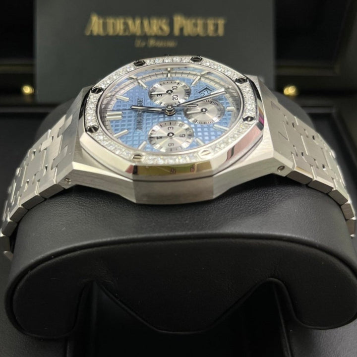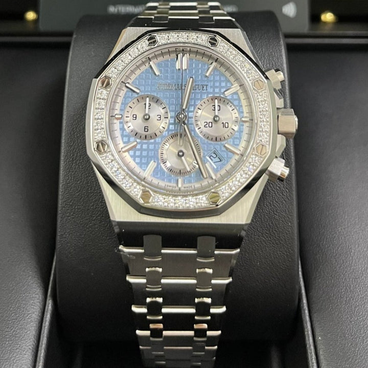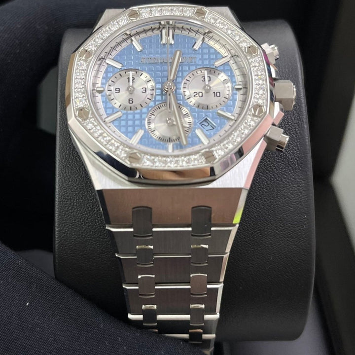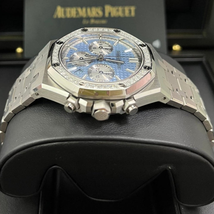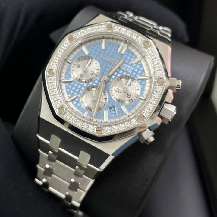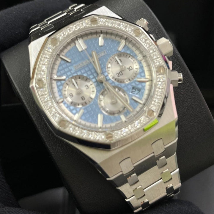 This 38 mm Chronograph elegantly marries stainless steel with a light blue “Grande Tapisserie” dial enhanced with a diamond-set bezel and silver-toned counters. The new Royal Oak design evolution confers the watch a slenderer aesthetic. Stainless steel case, bezel set with brilliant-cut diamonds, glareproofed sapphire crystal, screw-locked crown. Light blue dial with “Grande Tapisserie” pattern, silver-toned counters, white gold applied hour-markers and Royal Oak hands with luminescent coating. Stainless steel bracelet with AP folding clasp.