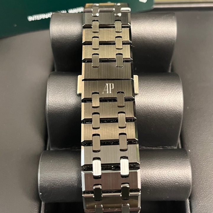 This all-black 41 mm Royal Oak Selfwinding Chronograph fully crafted in black ceramic and contrasted with subtle pink gold accents is endowed with the collection’s latest design evolution and “50-years” anniversary oscillating weight. Black ceramic case, glareproofed sapphire crystal and caseback, black ceramic pushpieces and screw-locked crown. Black dial with “Grande Tapisserie” pattern, black counters, pink gold applied hour-markers and Royal Oak hands with luminescent coating.