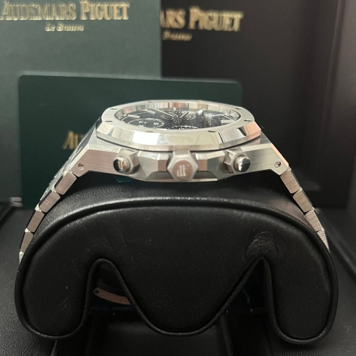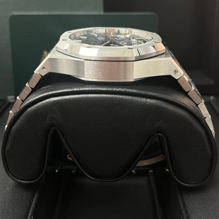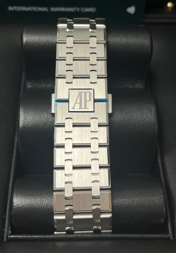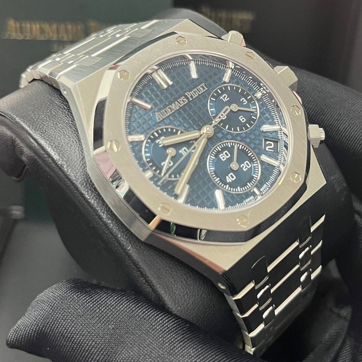 This 41 mm stainless steel Selfwinding Chronograph is endowed with the latest Royal Oak design evolution and encompasses a “Grande Tapisserie” dial in the iconic "Bleu Nuit, Nuage 50" hue. Stainless steel case, glareproofed sapphire crystal and caseback, screw-locked crown. “Bleu nuit nuage 50” dial with “Grande Tapisserie” pattern, “Bleu nuit nuage 50” counters, white gold applied hour-markers and Royal Oak hands with luminescent coating. Stainless steel bracelet with AP folding clasp.