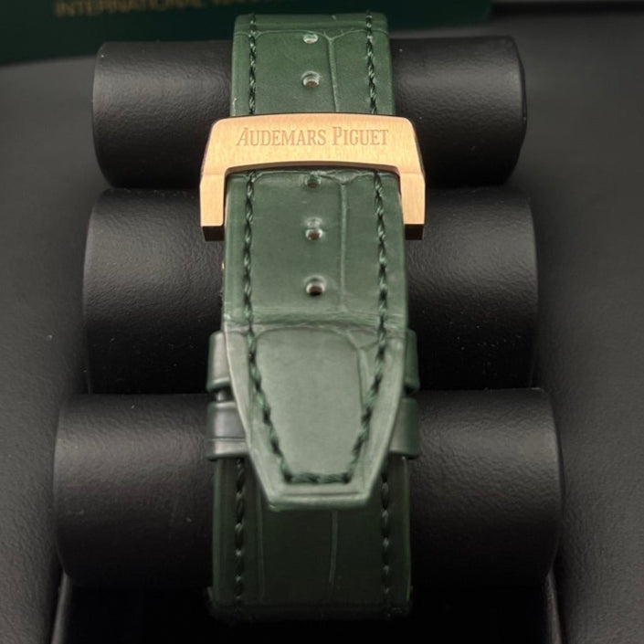 Khaki green dial with “Grande Tapisserie” pattern, green counters, pink gold applied hour-markers and Royal Oak hands with luminescent coating. Khaki green alligator strap with 18-carat pink gold AP folding clasp.