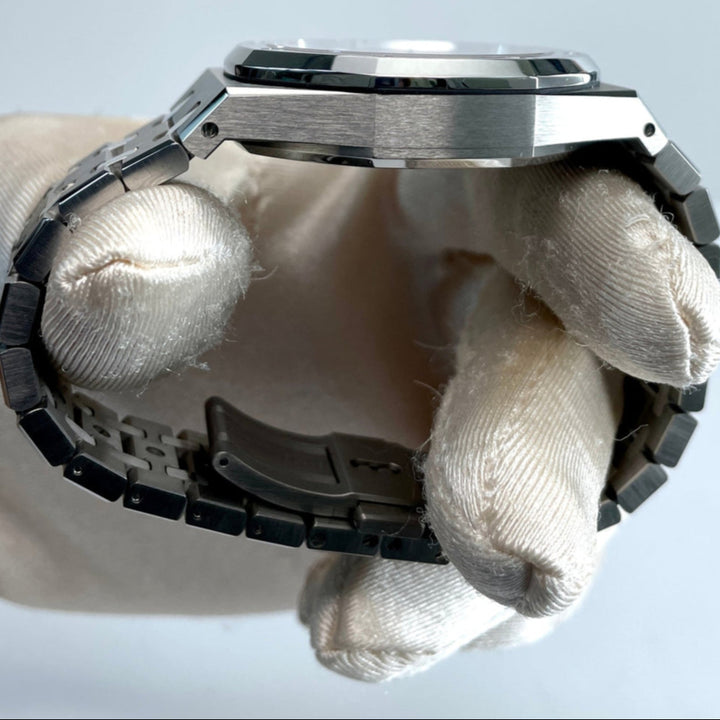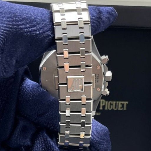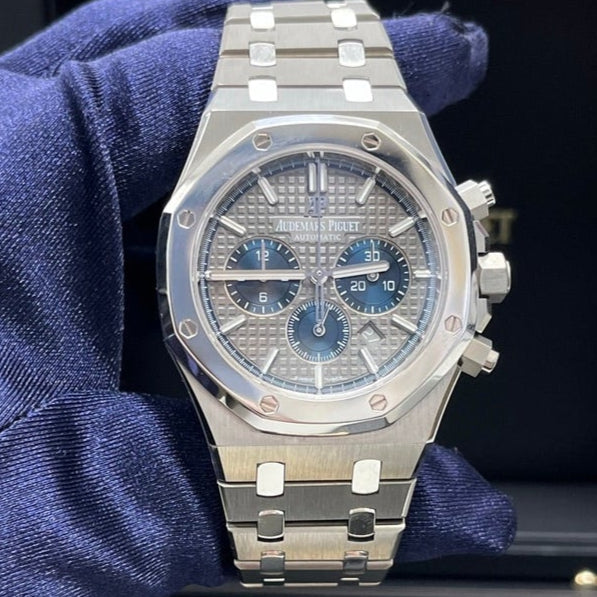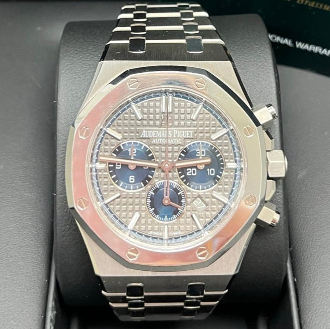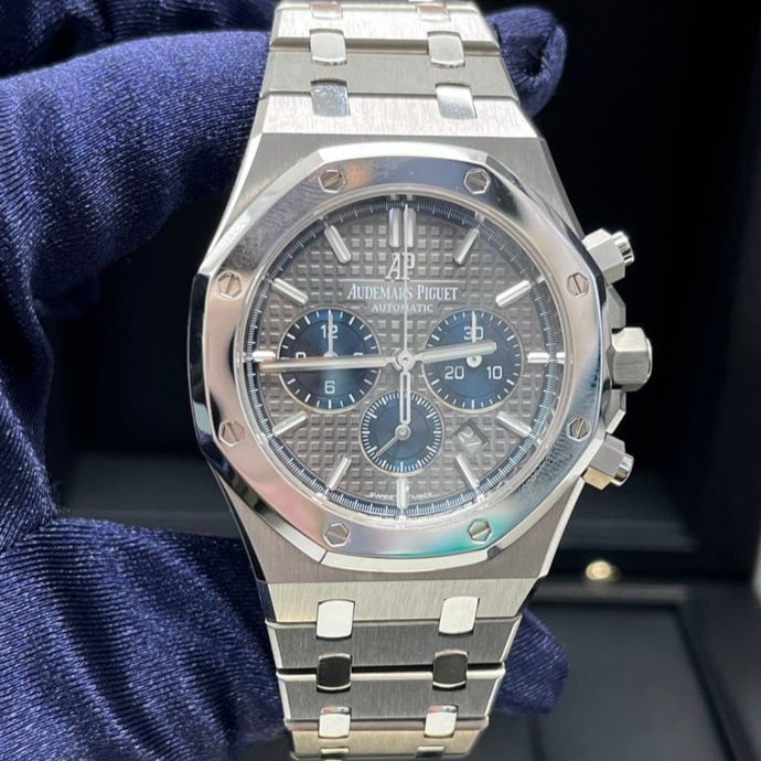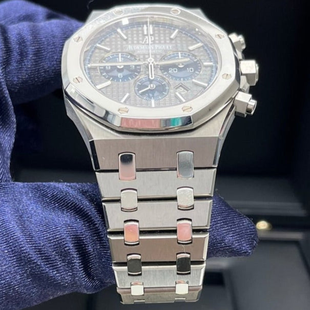 Slate grey dial with “Grande Tapisserie” pattern, blue counters, white gold applied hour-markers and Royal Oak hands with luminescent coating.