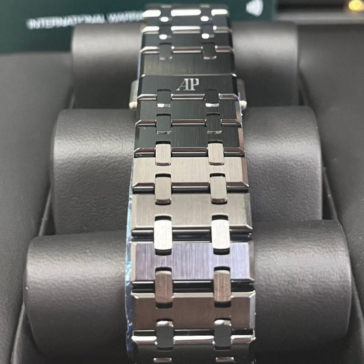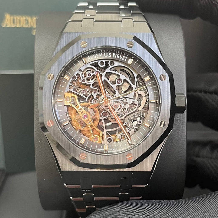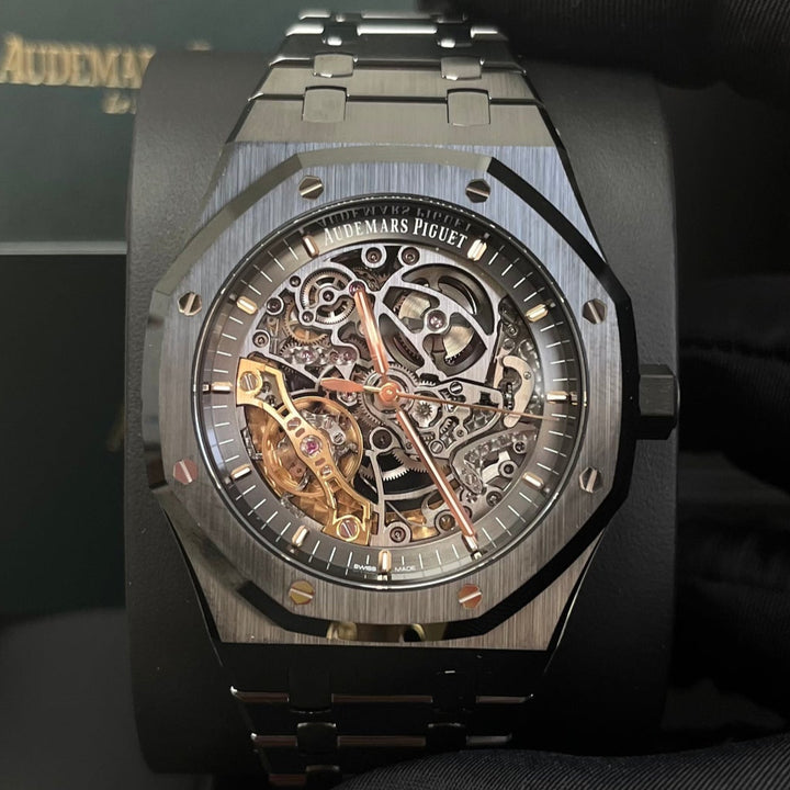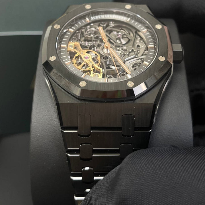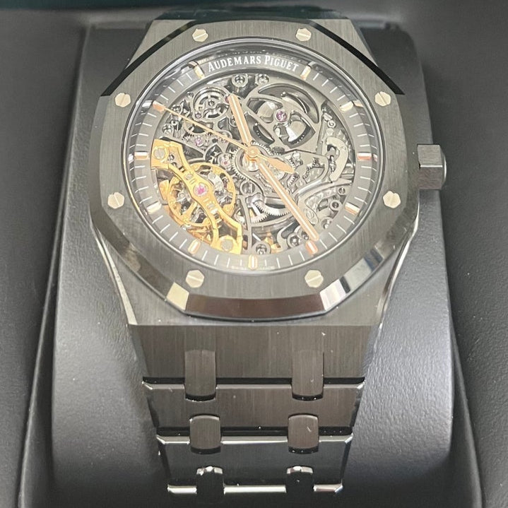 The Manufacture’s patented double balance wheel mechanism is clad in black ceramics and revealed on both sides of the watch through the openworked slate grey dial. Black ceramic case, glareproofed sapphire crystal and caseback, screw-locked crown. Openworked slate grey dial, pink gold applied hour-markers and Royal Oak hands with luminescent coating.Black ceramic bracelet with AP folding clasp.