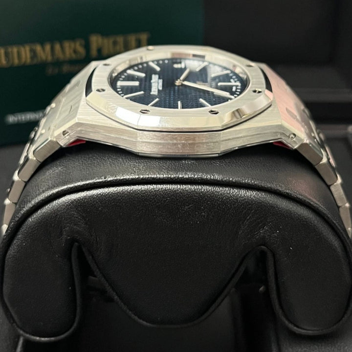 The Audemars Piguet Royal Oak Jumbo 15202ST is an icon of ultra-thin watchmaking, with its 39mm stainless steel case measuring just 8.1mm thick. The classic porthole design is refined and elegant. This watch features the signature blue "Petite Tapisserie" dial, providing a textured depth that shifts beautifully in different lighting.