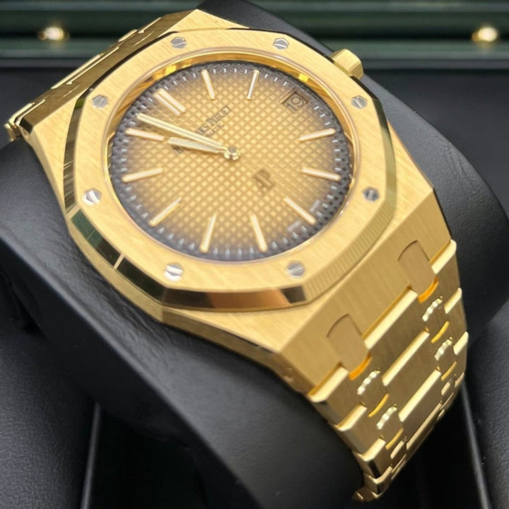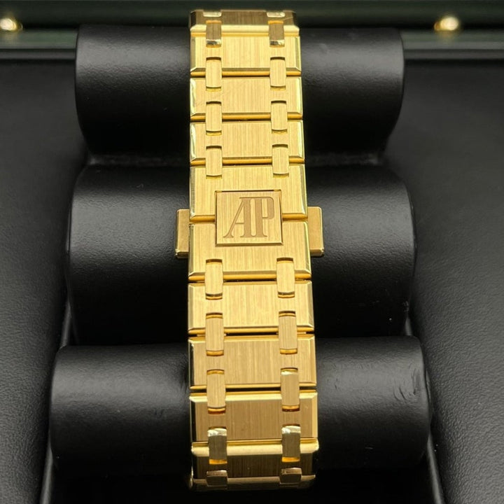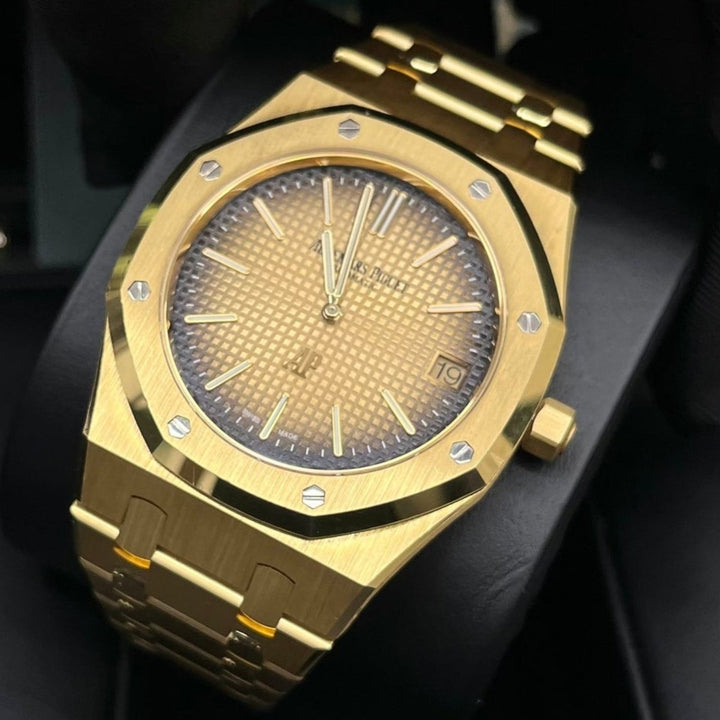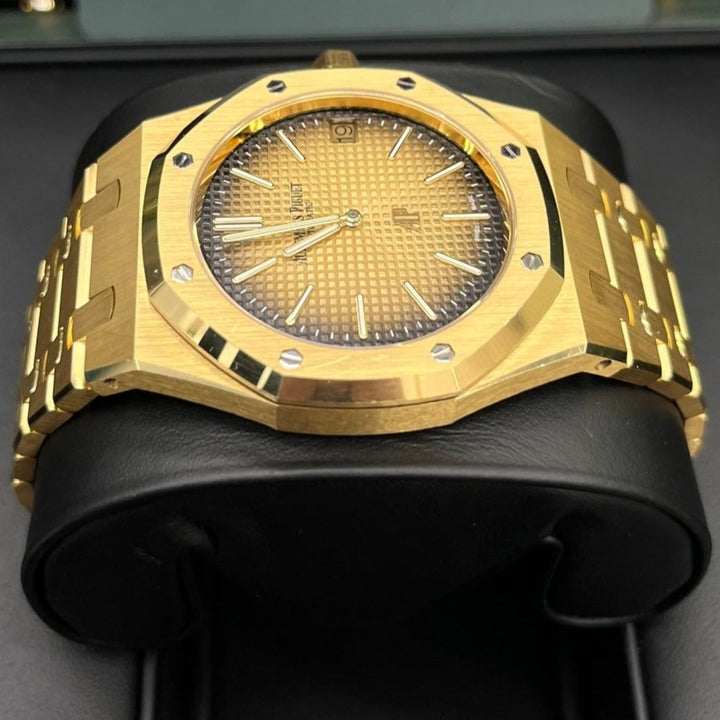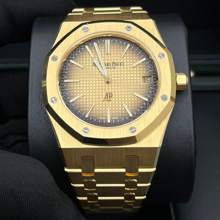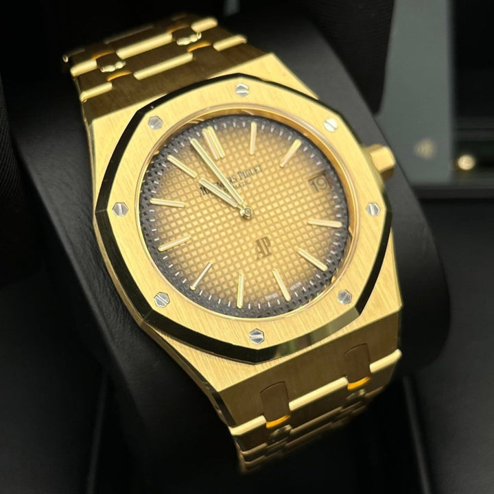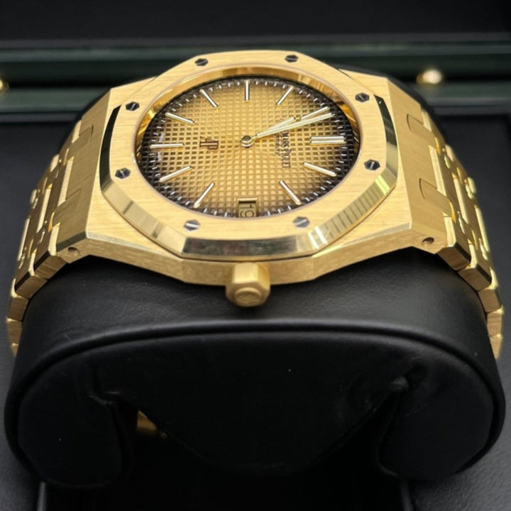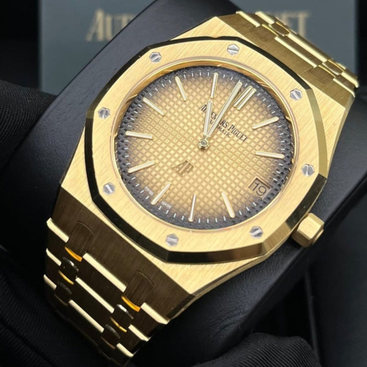 This “Jumbo” model accentuates the Royal Oak’s original codes with a yellow gold case and bracelet enhanced with a smoked yellow-gold-toned “Petite Tapisserie” dial. It houses the new selfwinding movement, Calibre 7121, and is fitted with the "50-years" oscillating weight which echoes the case colour. 18-carat yellow gold case, glareproofed sapphire crystal and caseback. Smoked yellow gold-toned dial with “Petite Tapisserie” pattern, yellow gold applied hour-markers and Royal Oak hands with luminescent coating.18-carat yellow gold bracelet with AP folding clasp.