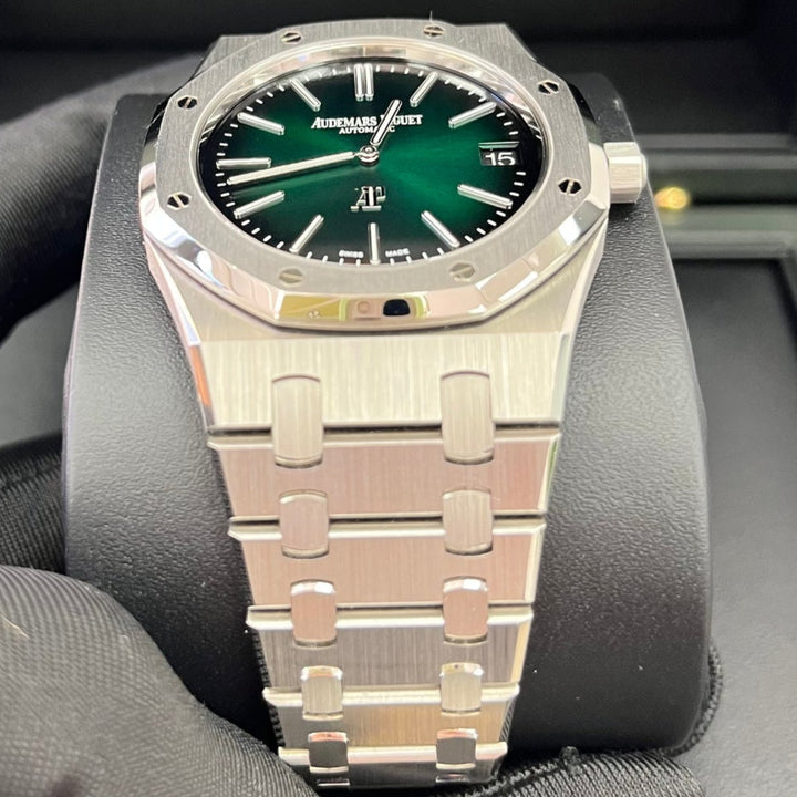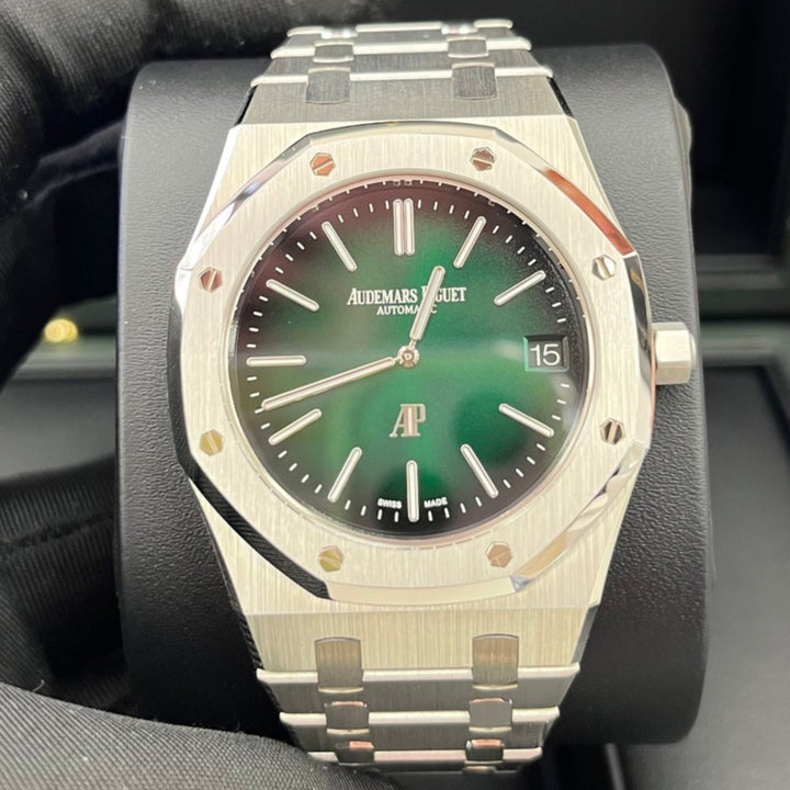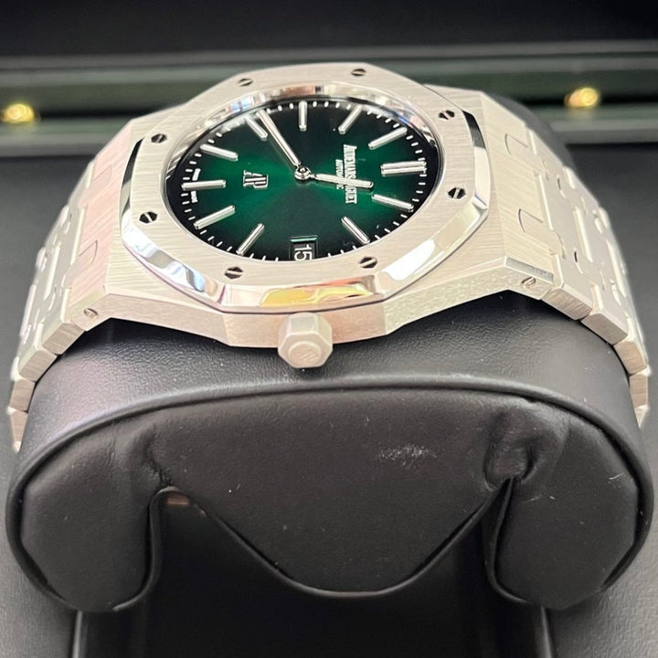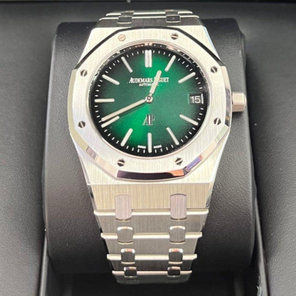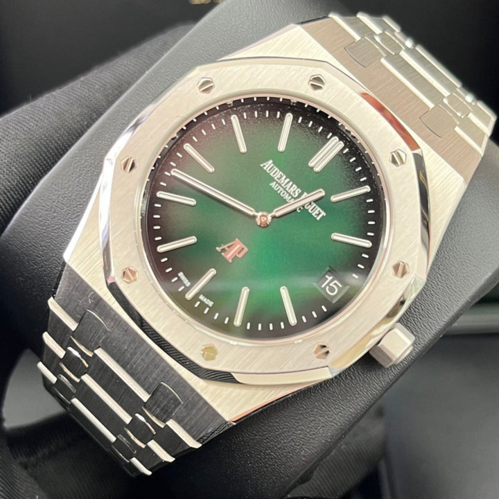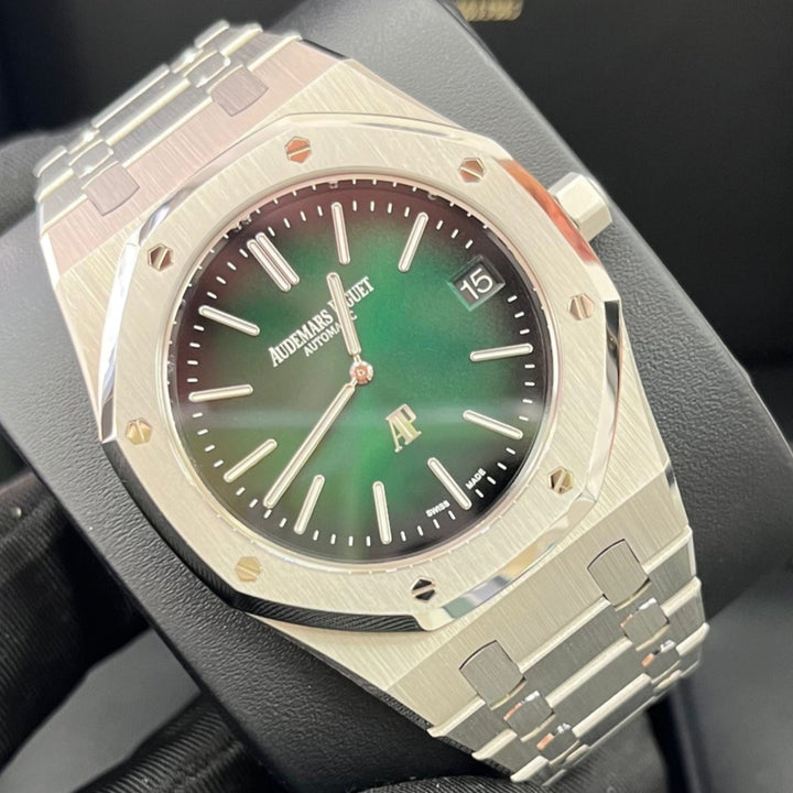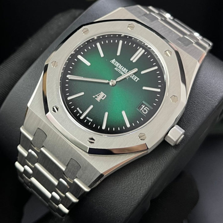 This Royal Oak "Jumbo" Extra-Thin in 950 platinum adorns a vibrant smoked green sunburst dial for a powerful contrast. 950 platinum case, glareproofed sapphire crystal and caseback. Smoked green dial with sunray pattern base, white gold applied hour-markers and Royal Oak hands with luminescent coating. 950 platinum bracelet with AP folding clasp