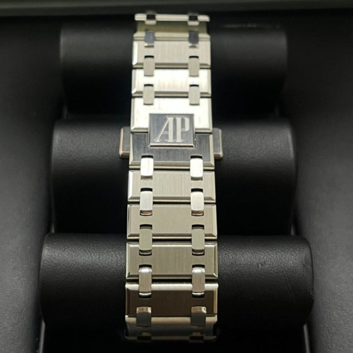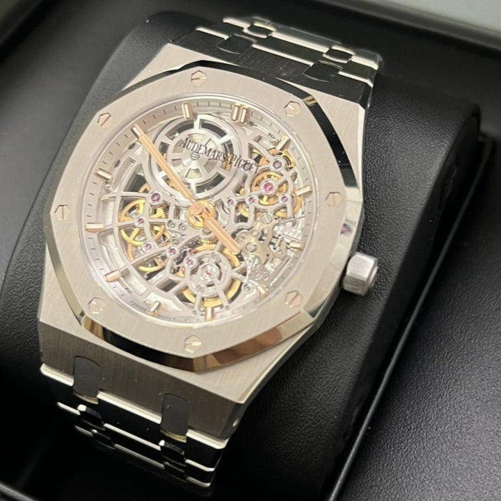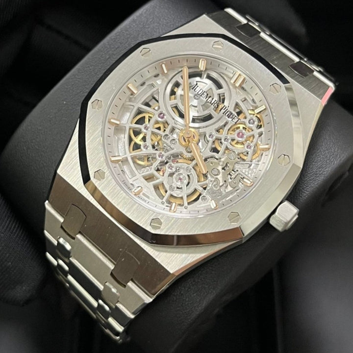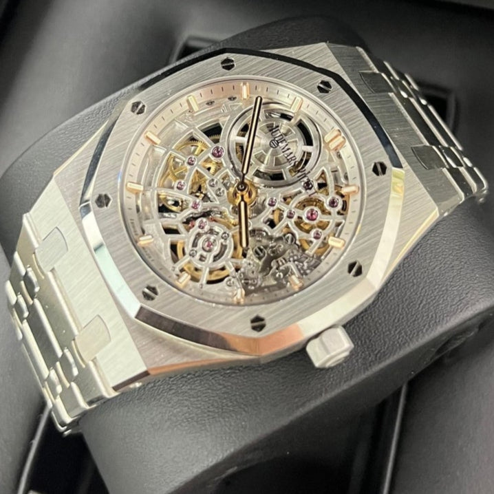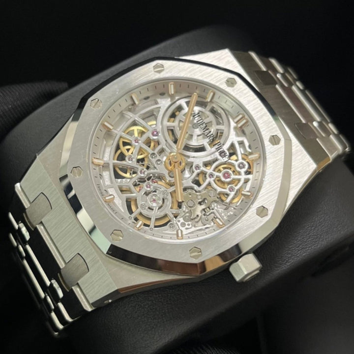 Openworking makes its come back in the Royal Oak collection with a dedicated movement, Calibre 7124. The rhodium-toned mainplate and bridges seamlessly echo the stainless steel case and bracelet. The matching "50-years" gold oscillating weight is visible through the sapphire caseback. Stainless steel case, glareproofed sapphire crystal and caseback. Openworked rhodium-toned dial, pink gold applied hour-markers and Royal Oak hands with luminescent coating. Stainless steel bracelet with AP folding clasp.