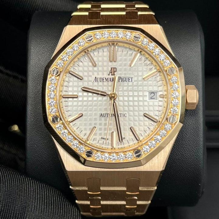 Selfwinding watch with date display and centre seconds. 18-carat pink gold case, silvered dial, 18-carat pink gold bracelet. 40 brilliant-cut diamonds; ~0.90 carat (bezel). 18-carat pink gold case with diamond-set bezel, glareproofed sapphire crystal and caseback, screw-locked crown. Silver-toned dial with “Grande Tapisserie” pattern, pink gold applied hour-markers and Royal Oak hands with luminescent coating