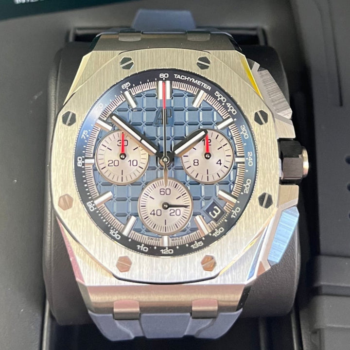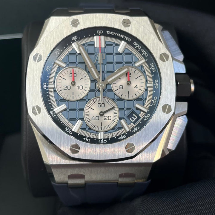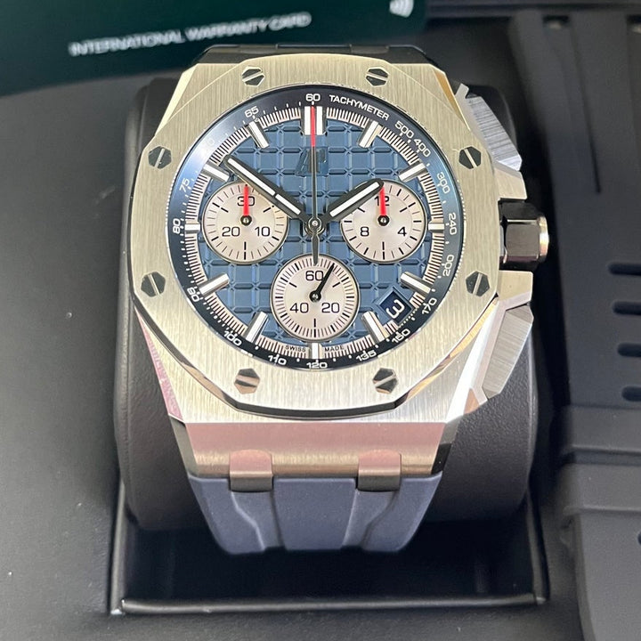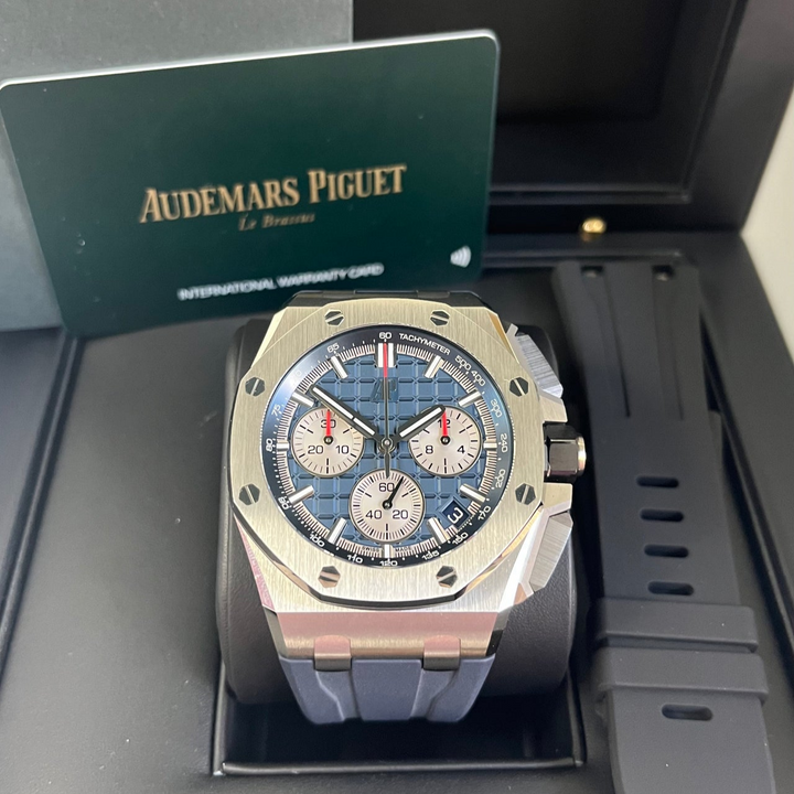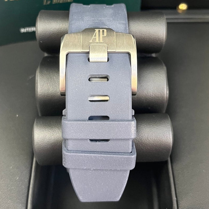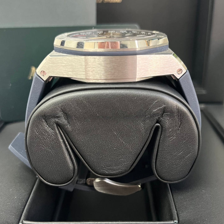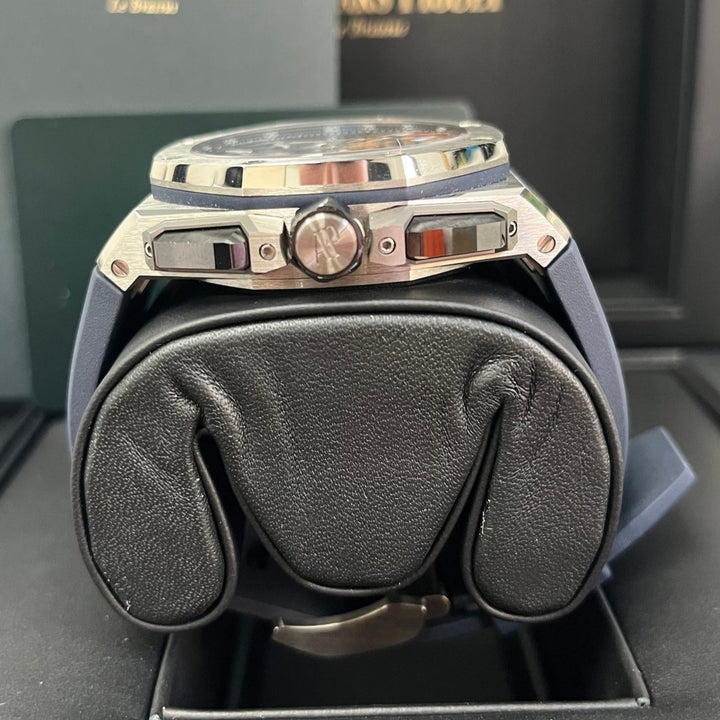 This all-titanium Royal Oak Offshore in 43 mm sports a blue "Méga Tapisserie" dial with high-end finishing as well as the Manufacture’s interchangeable strap system and latest integrated flyback chronograph. Titanium case and bezel, glareproofed sapphire crystal and caseback, black ceramic pushpieces and screw-locked crown, sandblasted titanium pushpiece guards. Blue dial with “Méga Tapisserie” pattern, rhodium-toned counters and external zone, white gold applied hour-markers and Royal Oak hands with luminescent coating, blue inner bezel. Blue rubber strap with titanium AP pin buckle and interchangeable strap system. Additional black rubber strap.