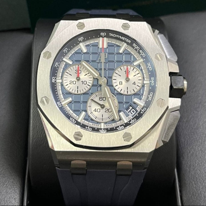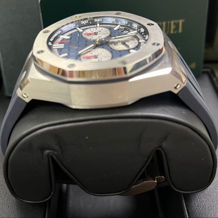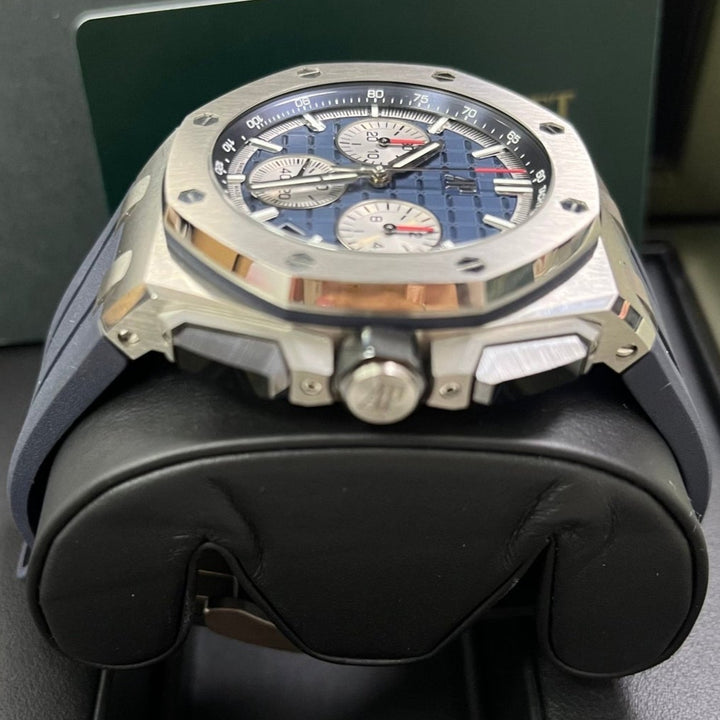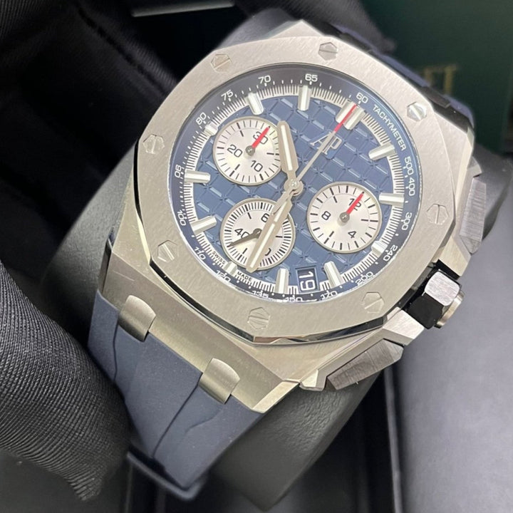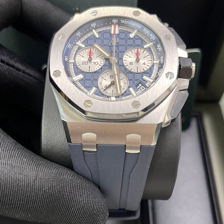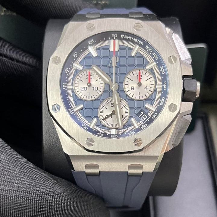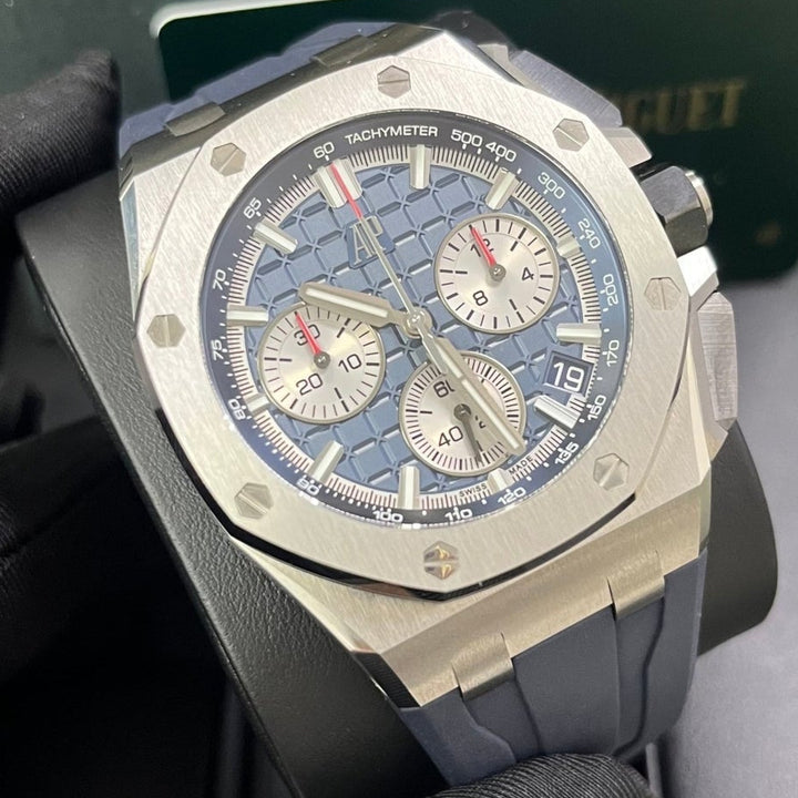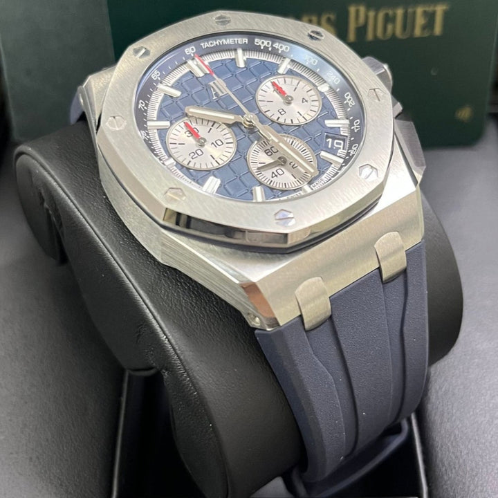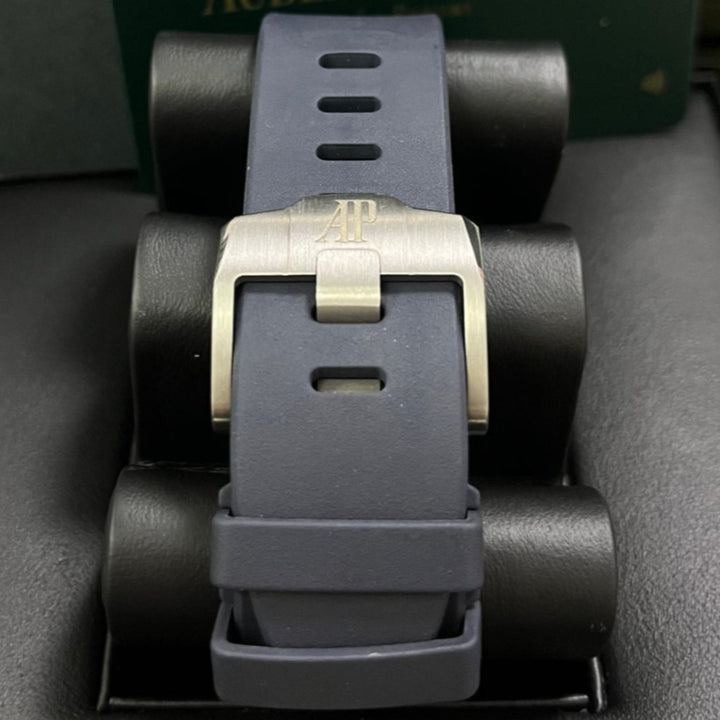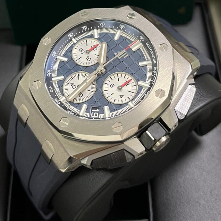 This all-titanium Royal Oak Offshore in 43 mm sports a blue "Méga Tapisserie" dial with high-end finishing as well as the Manufacture’s interchangeable strap system and latest integrated flyback chronograph. Titanium case and bezel, glareproofed sapphire crystal and caseback, black ceramic pushpieces and screw-locked crown, sandblasted titanium pushpiece guards. Blue dial with “Méga Tapisserie” pattern, rhodium-toned counters and external zone, white gold applied hour-markers and Royal Oak hands with luminescent coating, blue inner bezel. Blue rubber strap with titanium AP pin buckle and interchangeable strap system. Additional black rubber strap.