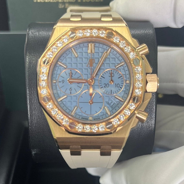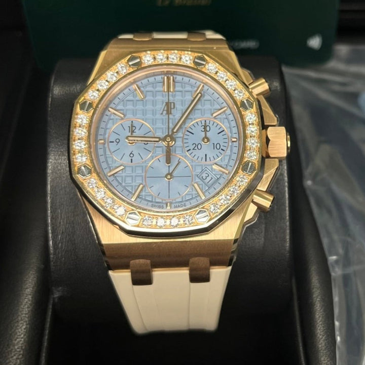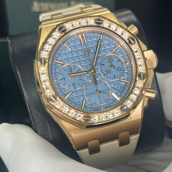 Combining a light blue "Lady Tapisserie" dial with brilliant-cut diamonds and a pink gold case, this new design brings a touch of elegance and refinement to the sporty Royal Oak Offshore Chronograph. 18-carat pink gold case, bezel set with brilliant-cut diamonds, glareproofed sapphire crystal, screw-locked crown. Light blue dial with “Lady Tapisserie” pattern, blue counters, pink gold applied hour-markers and Royal Oak hands with luminescent coating. Beige rubber strap with 18-carat pink gold pin buckle and interchangeable strap system. Additional light blue rubber strap.