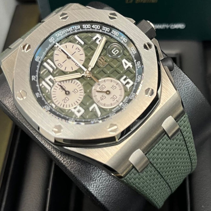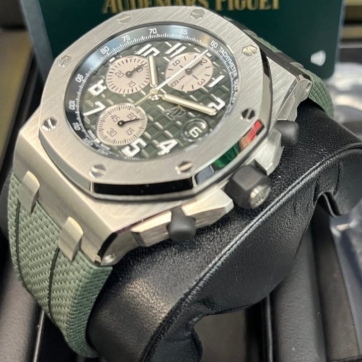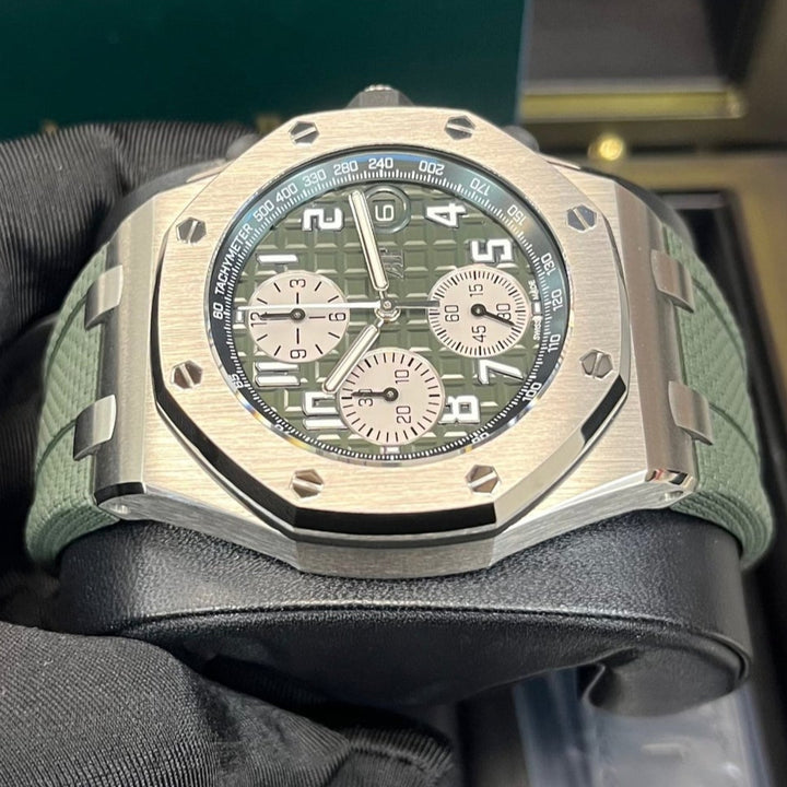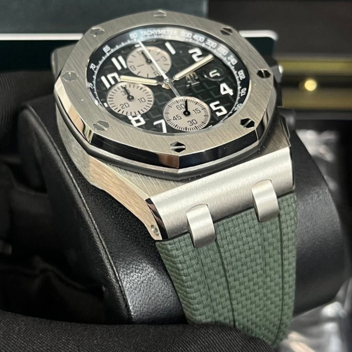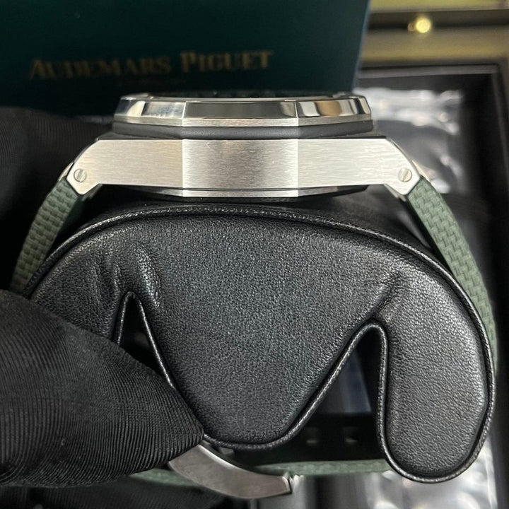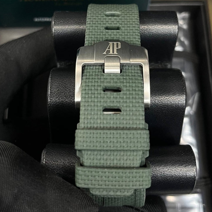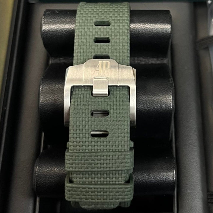 Khaki green dial with “Mega Tapisserie” pattern, silver-toned counters, arabic numerals hour-markers and white gold Royal Oak hands with luminescent coating, khaki green inner bezel. Khaki green rubber strap with textile decoration with titanium AP pin buckle and interchangeable strap system. Additional black calfskin strap.