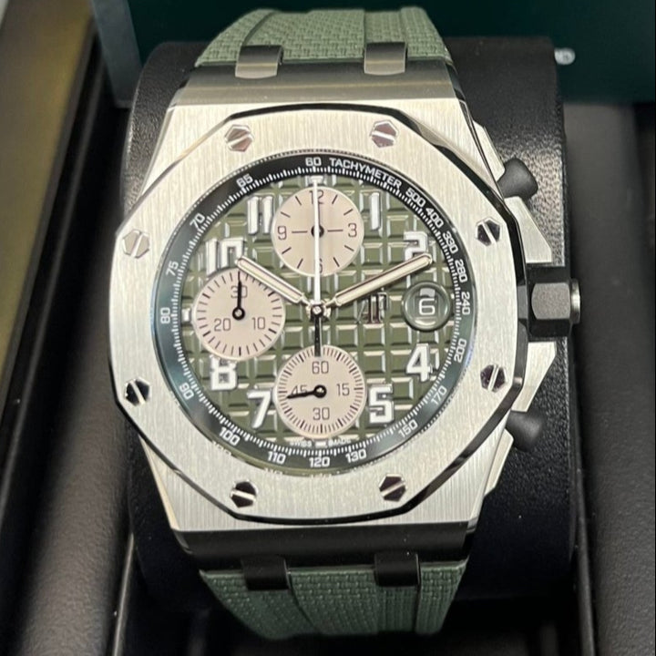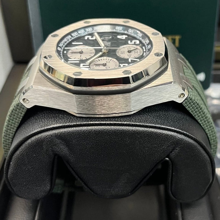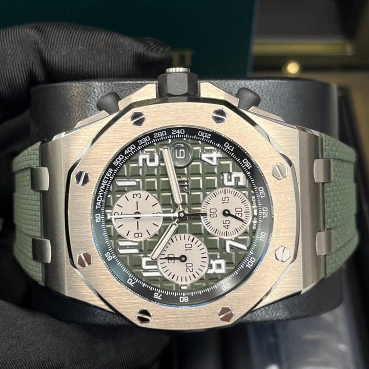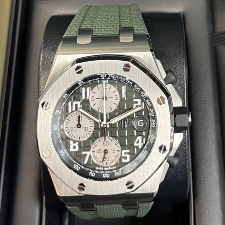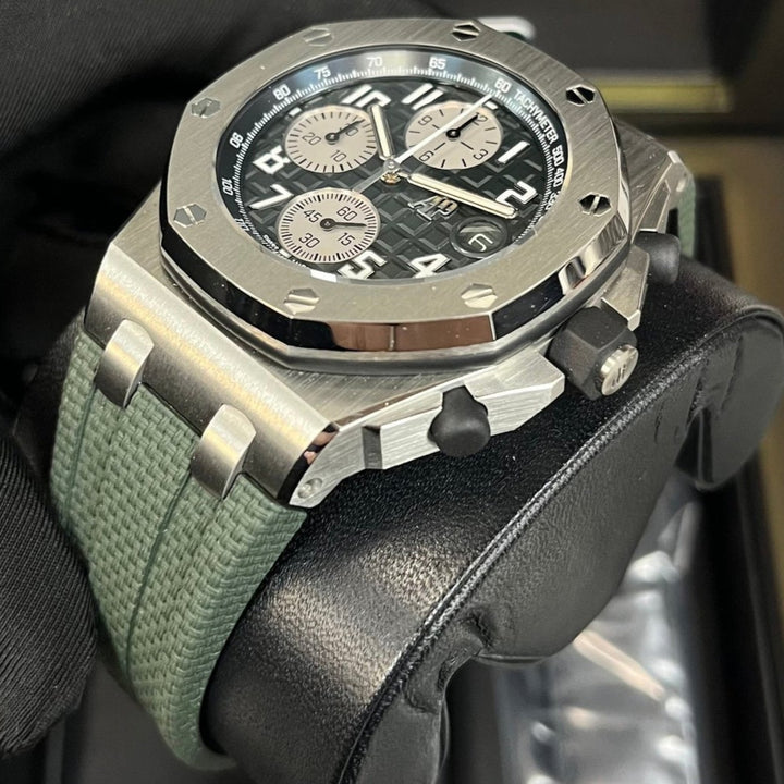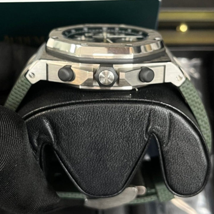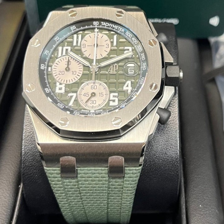 Khaki green dial with “Mega Tapisserie” pattern, silver-toned counters, arabic numerals hour-markers and white gold Royal Oak hands with luminescent coating, khaki green inner bezel. Khaki green rubber strap with textile decoration with titanium AP pin buckle and interchangeable strap system. Additional black calfskin strap.