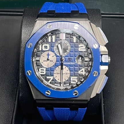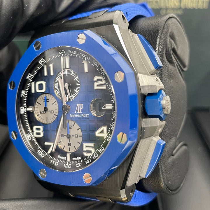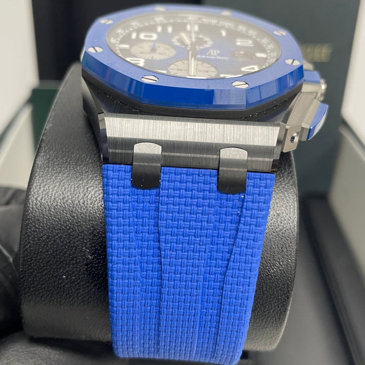Audemars Piguet Royal Oak Offshore Selfwinding Chronograph/ Stainless Steel/ Blue Strap/ Blue Dial / White Sub-Dials/ Blue Ceramic Bezel (Ref#26405CE.OO.A030CA.01)