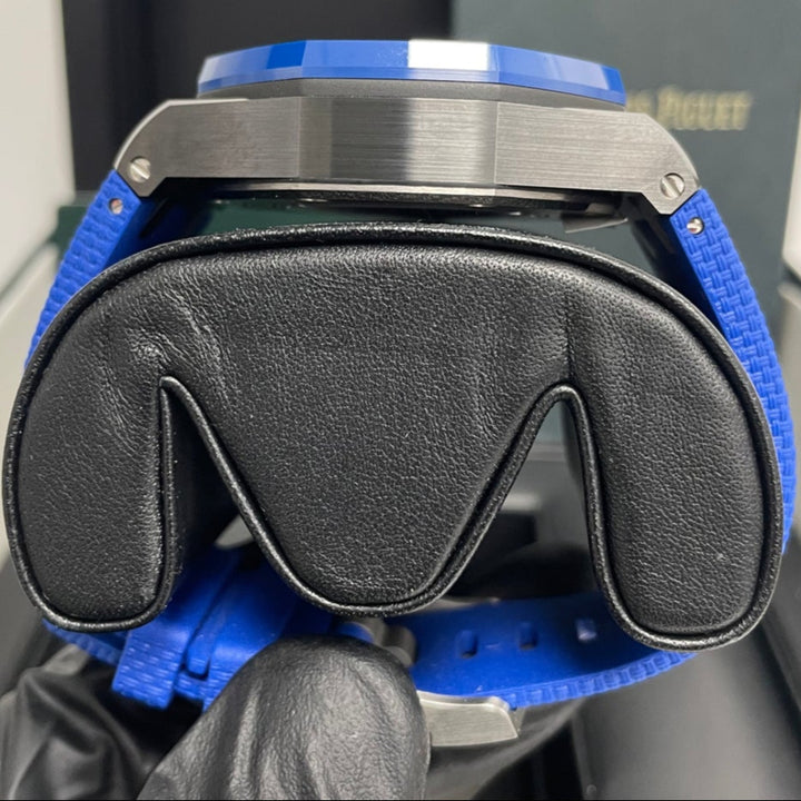 44mm Black ceramic case, glare-proof sapphire crystal, and case back, blue ceramic bezel, push-pieces and screw-locked crown, titanium push-piece guards. 14.4 case thickness, Smoked blue dial with “Mega Tapisserie” pattern, rhodium-toned counters, black inner bezel, white gold Arabic numerals, and Royal Oak hands with luminescent coating. Blue rubber strap with “textile” decoration, titanium pin buckle. 50 hours power reserve, 59 number of jewels, Calibre 3126 / 3840 Manufacture and water-resistant up to 100 meters.