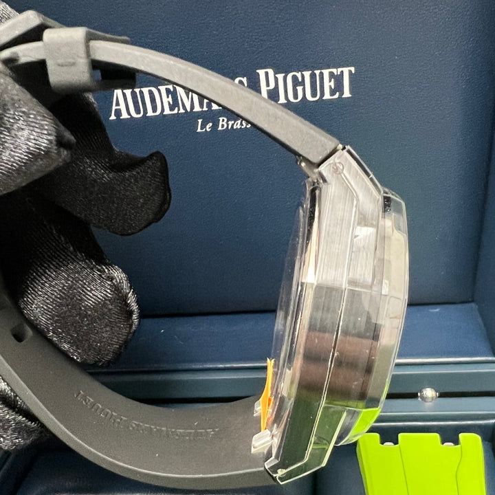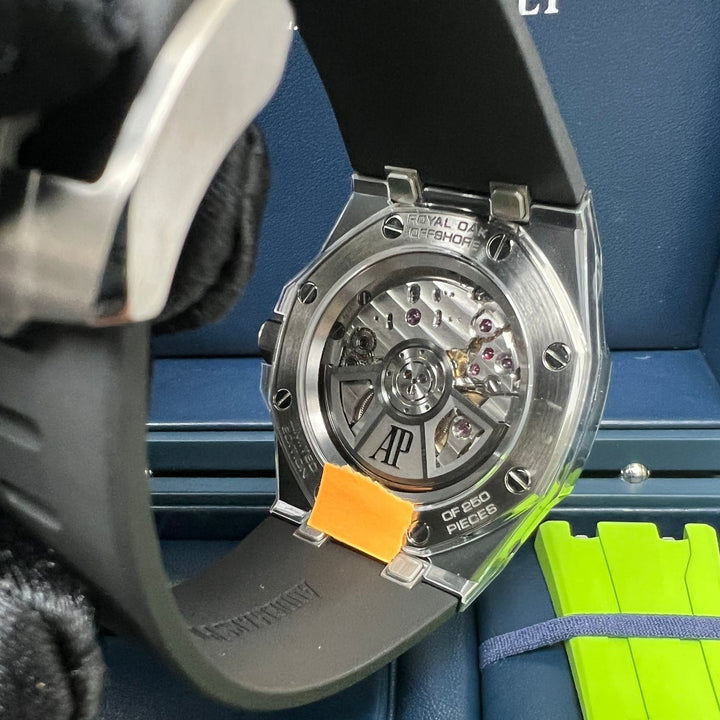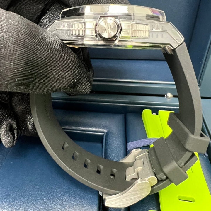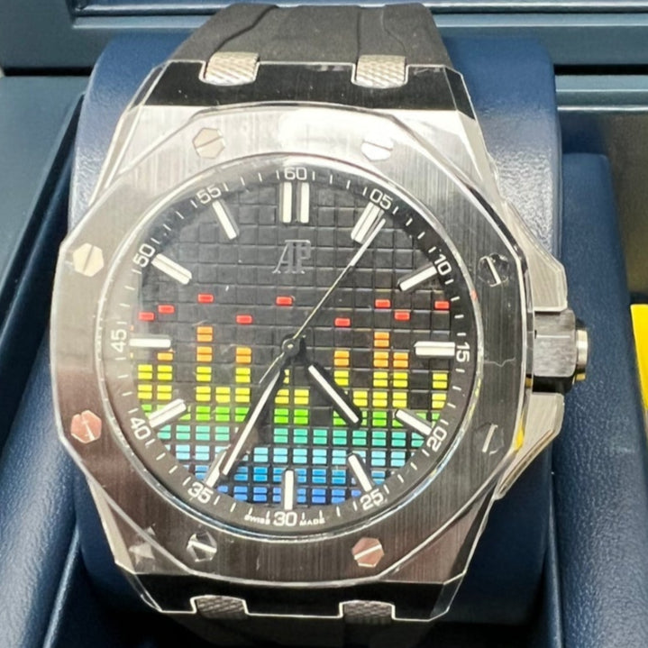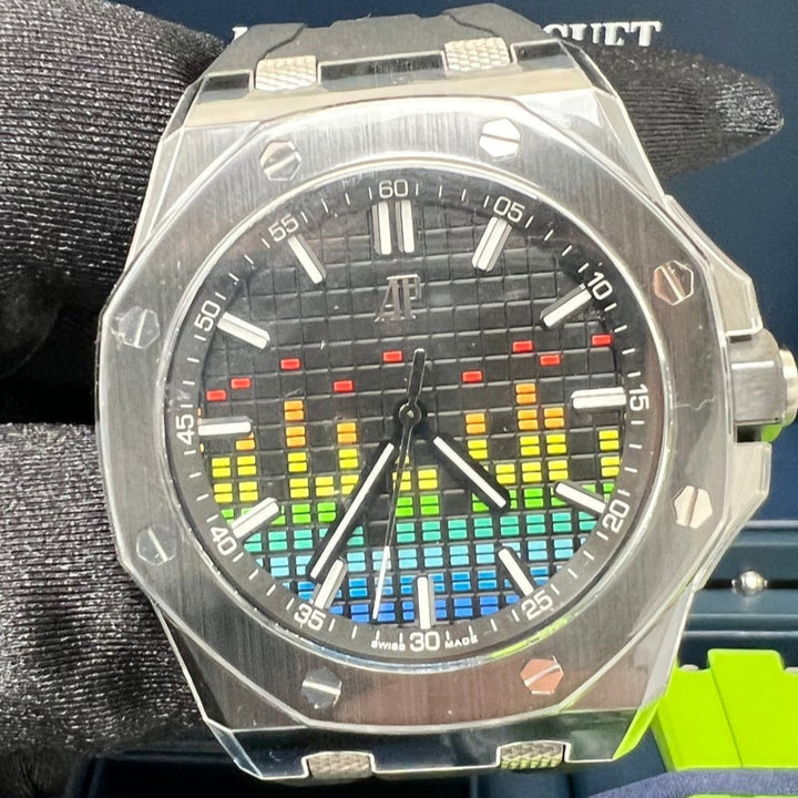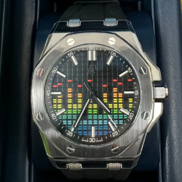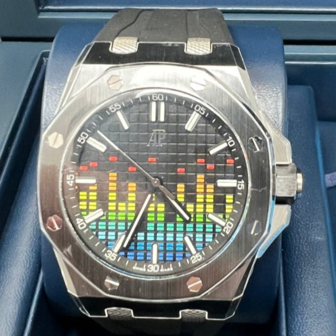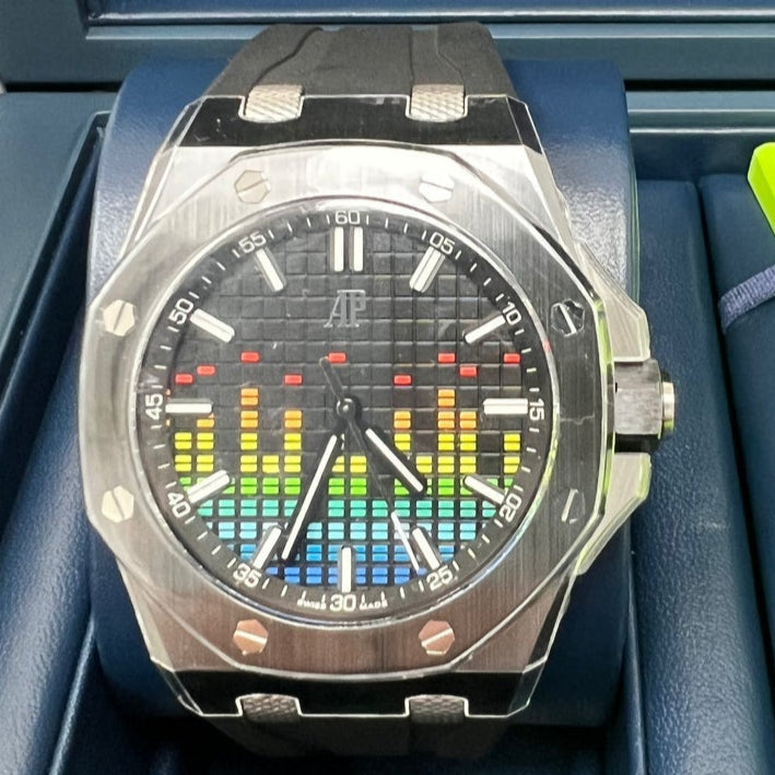 The aesthetic of this 43 mm black ceramic Royal Oak Offshore Selfwinding limited edition is inspired by music with its dial representing a VU meter and its push-piece guards evoking mixer faders. A black interchangeable rubber strap complements the overall design. Black ceramic case and bezel, glareproofed sapphire crystal and caseback, black ceramic screw-locked crown, titanium crown guards and links.Black dial with printed VU meter, white gold applied hour-markers and Royal Oak hands with luminescent coating. Black rubber strap with titanium AP pin buckle and interchangeable strap system. Additional turquoise blue, yellow and green rubber strap