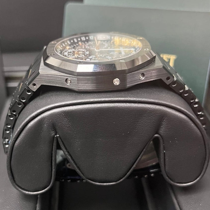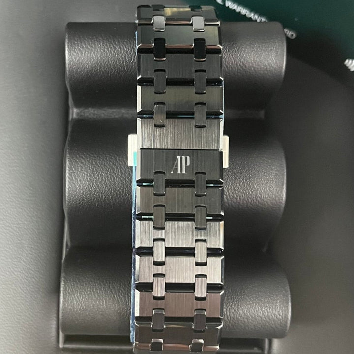 A feat of technical mastery, the Royal Oak Perpetual Calendar Openworked dresses the artistic openworked sapphire dial and the movement’s visible pink gold components in black ceramics. Black ceramic case, glareproofed sapphire crystal and black ceramic caseback, screw-locked crown. Sapphire dial, smoked external zone of the counters, pink gold applied hour-markers and Royal Oak hands with luminescent coating, black inner bezel. Black ceramic bracelet with titanium AP folding clasp.