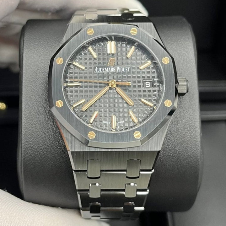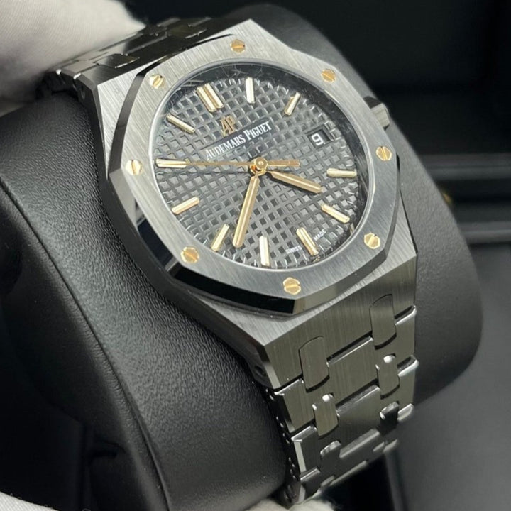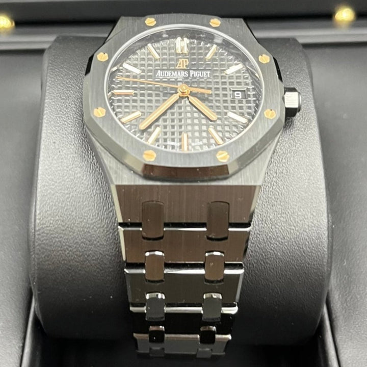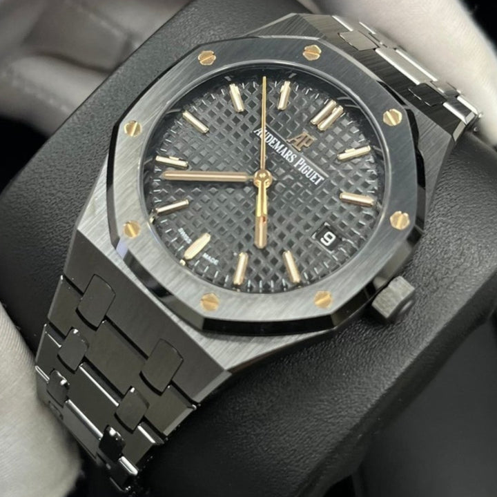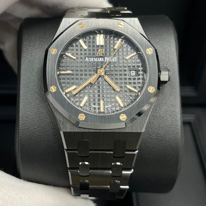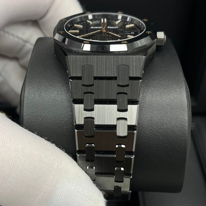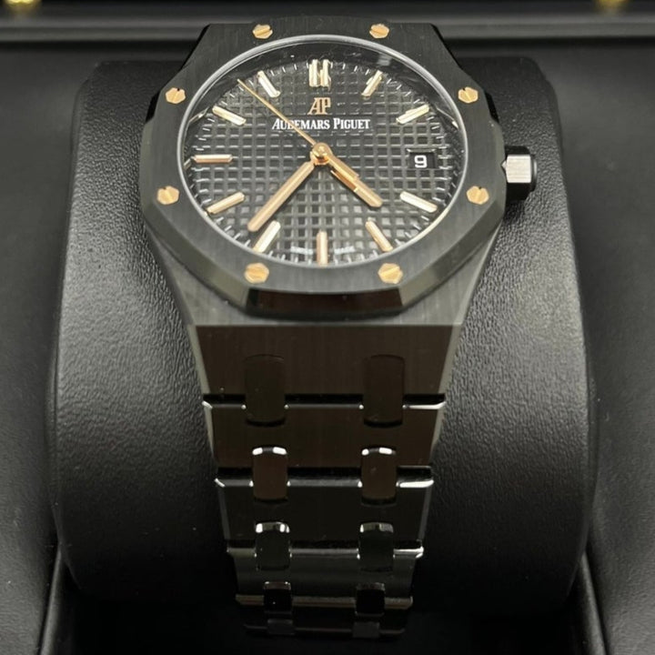 The sleek aesthetics of this 34 mm timepiece in black ceramics—the first dedicated to the slenderest wrists—is enhanced with pink gold accents for a refined two-tone contrast. Black ceramic case, 18-carat pink gold screws, glareproofed sapphire crystal and titanium caseback. Black dial with “Grande Tapisserie” pattern, pink gold applied hour-markers and Royal Oak hands with luminescent coating . Black ceramic bracelet with AP folding clasp