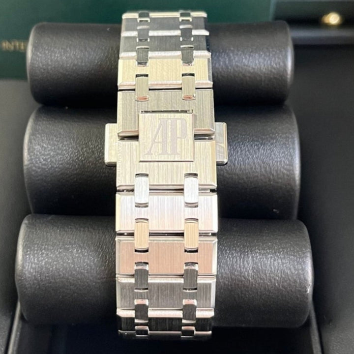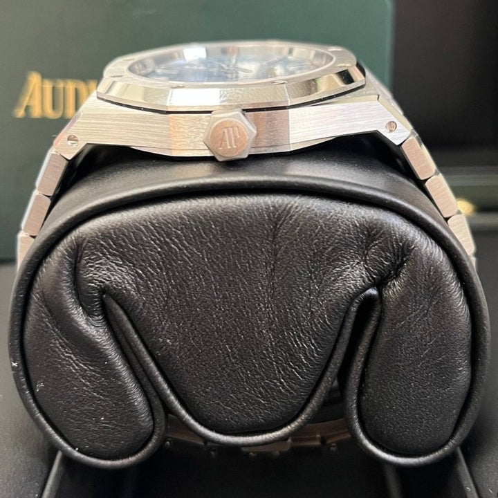 In addition to showcasing the Royal Oak design evolution debuted in 2022, this 37 mm stainless steel timepiece adorns a light blue “Grande Tapisserie” dial. The model is equipped with the latest generation selfwinding Calibre 5900. Stainless steel case, glareproofed sapphire crystal and caseback. Light blue dial with “Grande Tapisserie” pattern, white gold applied hour-markers and Royal Oak hands with luminescent coating. Stainless steel bracelet with AP folding clasp.