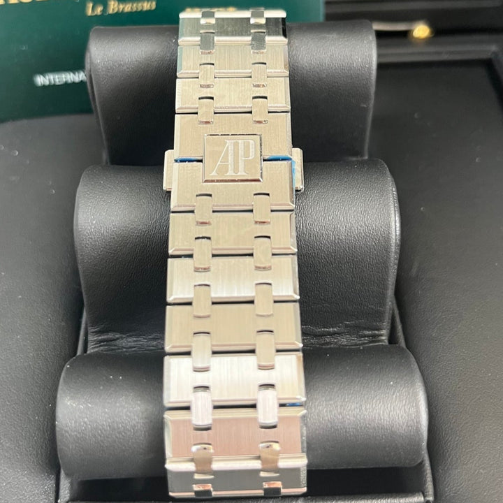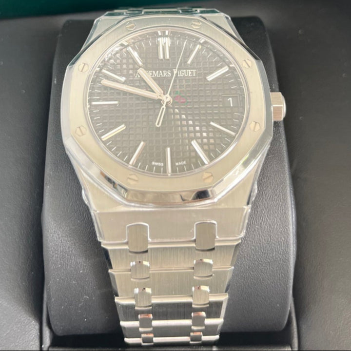 This monochromatic 41 mm Royal Oak Selfwinding, which unites stainless steel with a grey Grande Tapisserie dial, encompasses the collection’s refined and ergonomic design evolution. Stainless steel case, glareproofed sapphire crystal and caseback, screw-locked crown. Grey dial with “Grande Tapisserie” pattern, white gold applied hour-markers and Royal Oak hands with luminescent coating. Stainless steel bracelet with AP folding clasp.