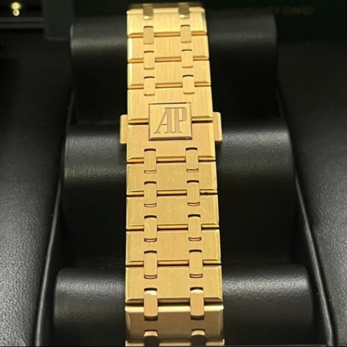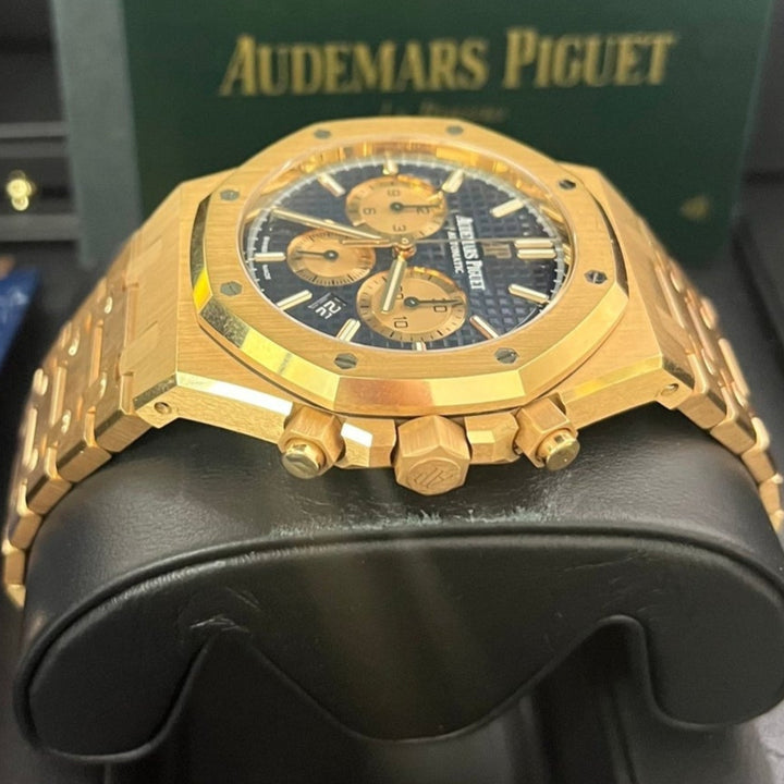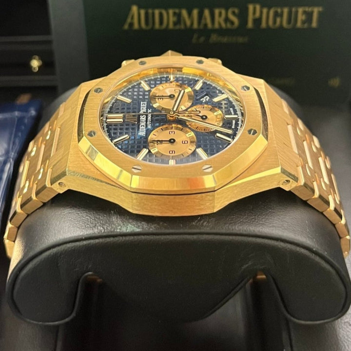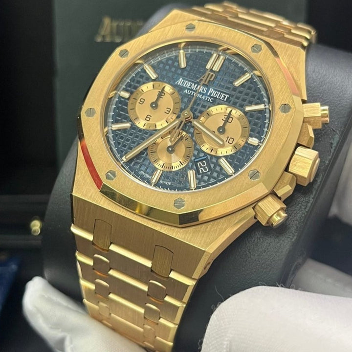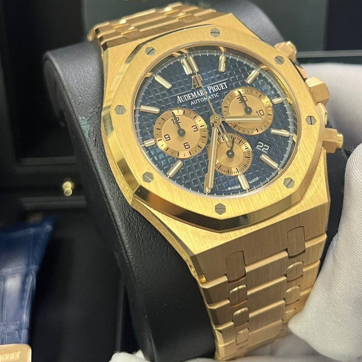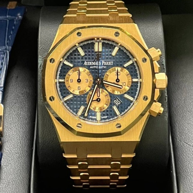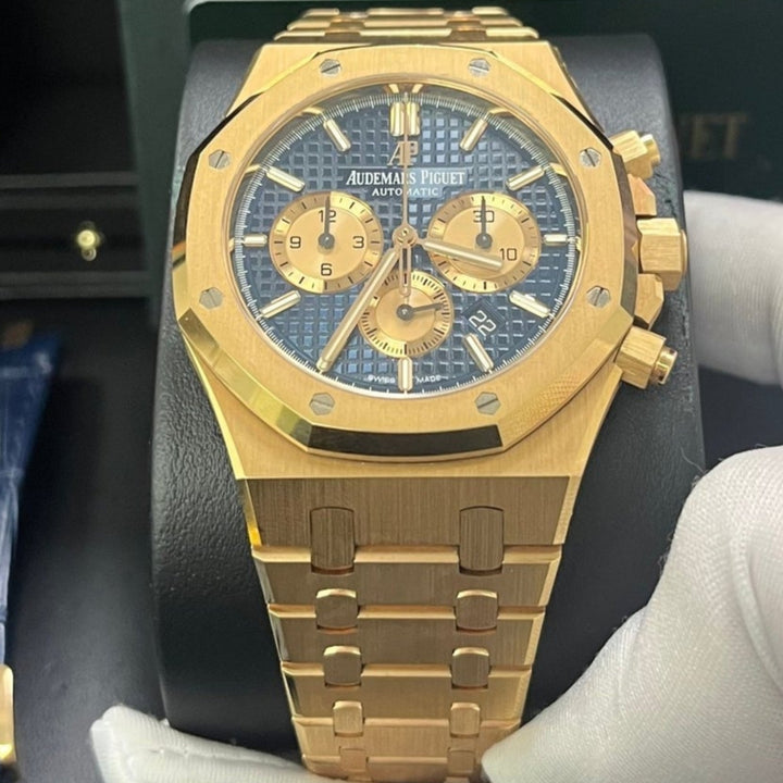 41mm 18K Pink Gold case, 11mm thick, screw-locked crown, glare-proof sapphire crystal, blue dial with Grande Tapisserie” pattern, pink gold-toned counters, pink gold applied hour-markers and Royal Oak hands with luminescent coating, Calibre 2385 selfwinding movement with chronograph, hours, minutes, small seconds, date, approximately 40 hours of power reserve, 18K pink gold bracelet, AP folding buckle. Water-resistant up to 50 meters.