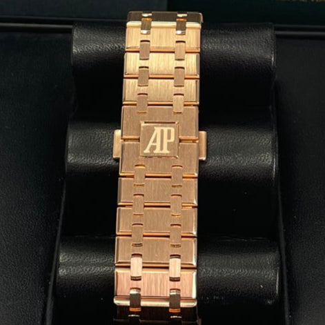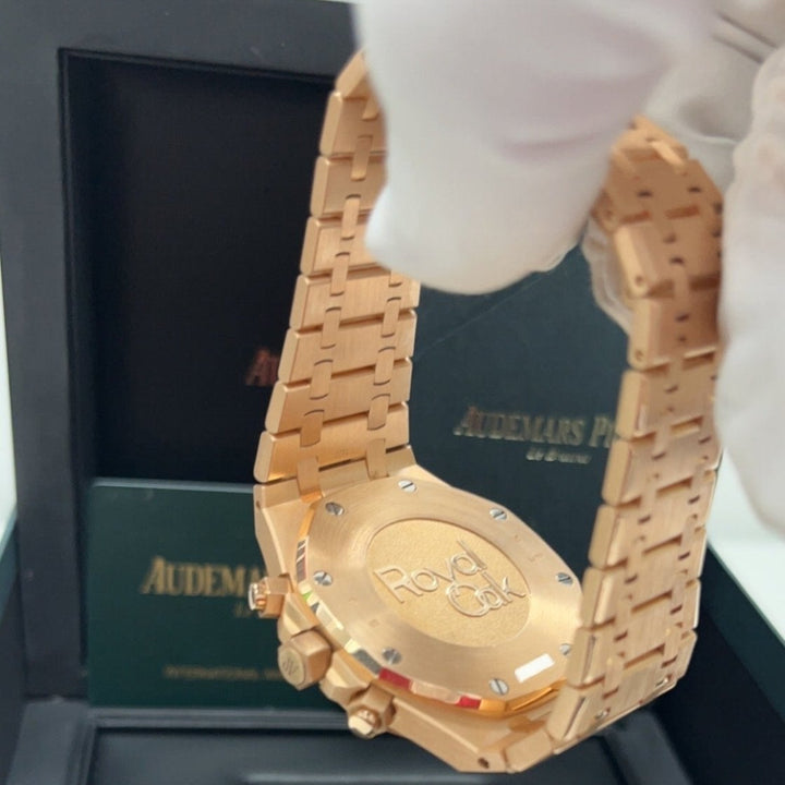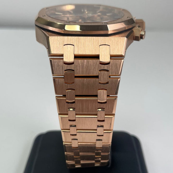 41mm 18K rose gold case, 11mm thick, featuring a screw-locked crown and glare-proof sapphire crystal. The brown dial with Grande Tapisserie pattern is accented by pink gold-toned sub-dials, rose gold applied hour-markers, and luminescent Royal Oak hands for legibility.