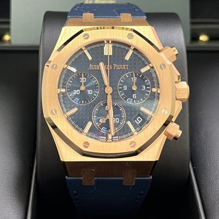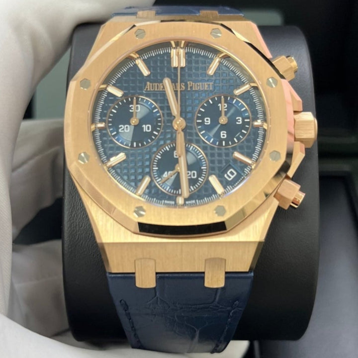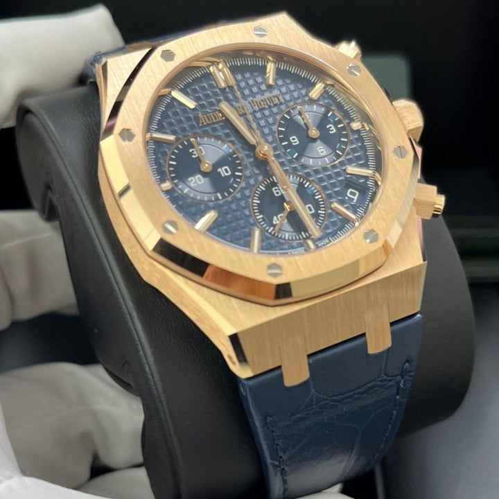 “Bleu nuit nuage 50” dial with “Grande Tapisserie” pattern, “Bleu nuit nuage 50” counters, pink gold applied hour-markers and Royal Oak hands with luminescent coating.