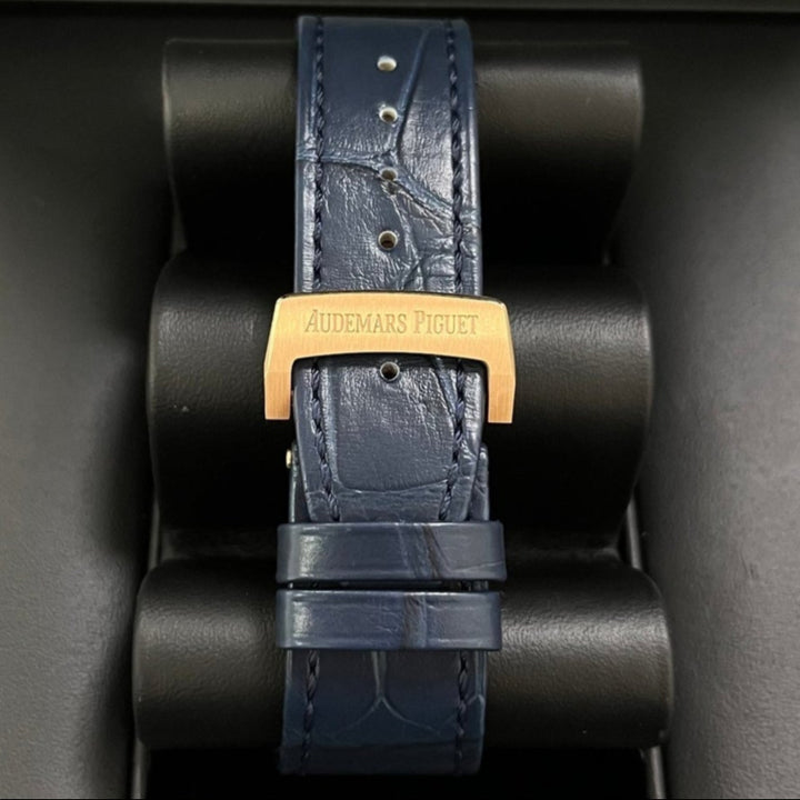 Blue alligator strap with 18-carat pink gold AP folding clasp.