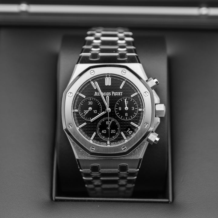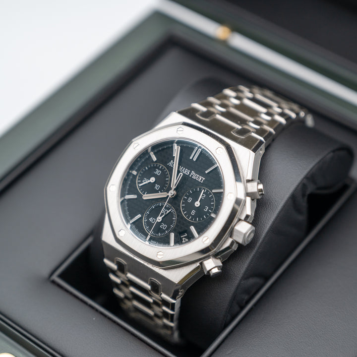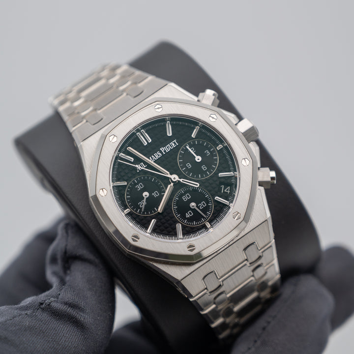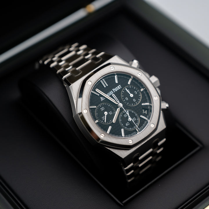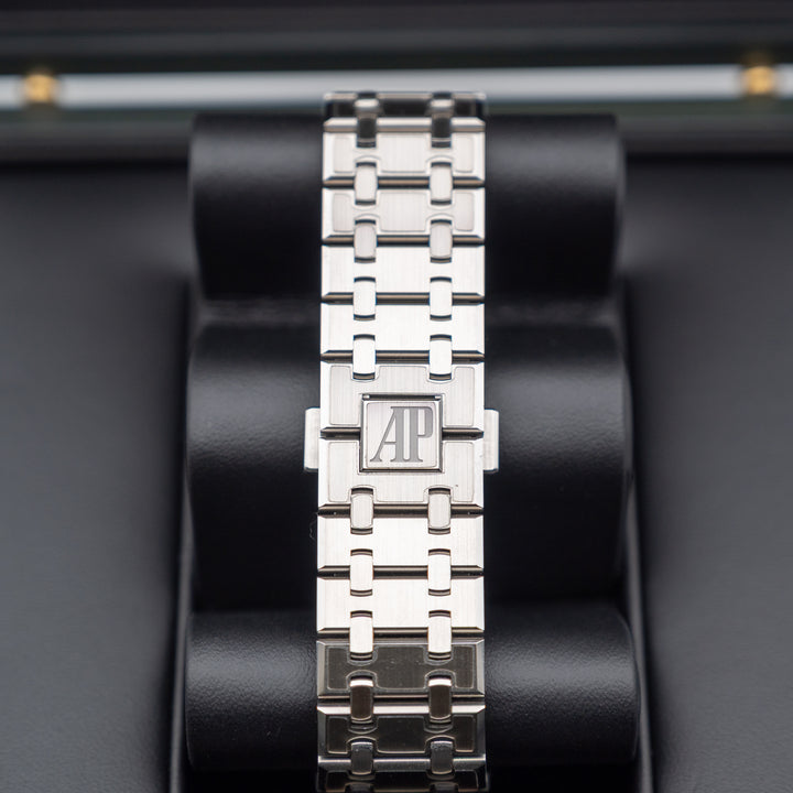 Black dial with “Grande Tapisserie” pattern, black counters, white gold applied hour-markers and Royal Oak hands with luminescent coating.