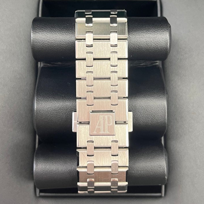 Khaki green dial with “Grande Tapisserie” pattern, khaki green counters, white gold applied hour-markers and Royal Oak hands with luminescent coating.