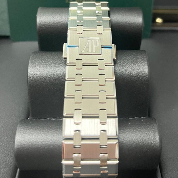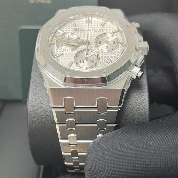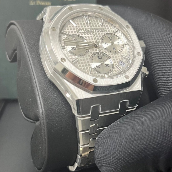 This 41 mm stainless steel Chronograph adorns a silver-toned “Grande Tapisserie” dial which nicely complements the watch’s slenderer aesthetic bestowed by the new Royal Oak design evolution. It is also fitted with the “50-years” oscillating weight.