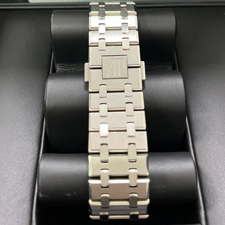 41mm stainless steel case, 11mm thick, screw-locked crown, glare-proof sapphire crystal, black dial with "Grande Tapisserie" pattern, silver-toned counters, white gold applied hour-markers and Royal Oak hands with luminescent coating, Calibre 2385 self-winding movement with chronograph, hours, minutes, small seconds, date, approximately 40 hours of power reserve, stainless steel bracelet, AP folding buckle. Water-resistant up to 50 meters.