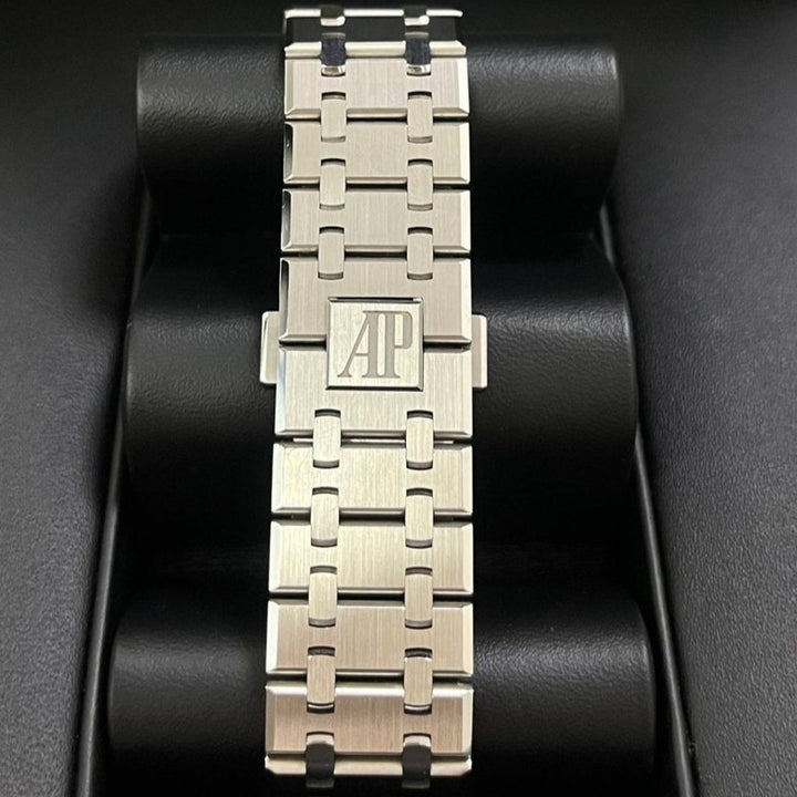 Black dial with “Grande Tapisserie” pattern, black counters, white gold applied hour-markers and Royal Oak hands with luminescent coating.