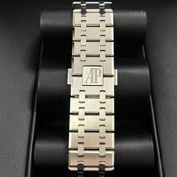 Black dial with “Grande Tapisserie” pattern, black counters, white gold applied hour-markers and Royal Oak hands with luminescent coating.