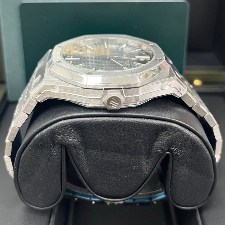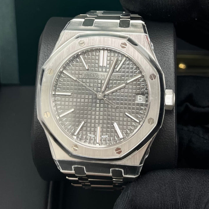 Grey dial with “Grande Tapisserie” pattern, white gold applied hour-markers and Royal Oak hands with luminescent coating.