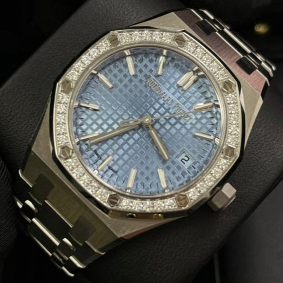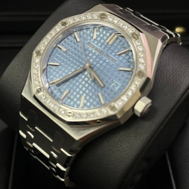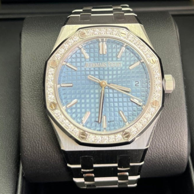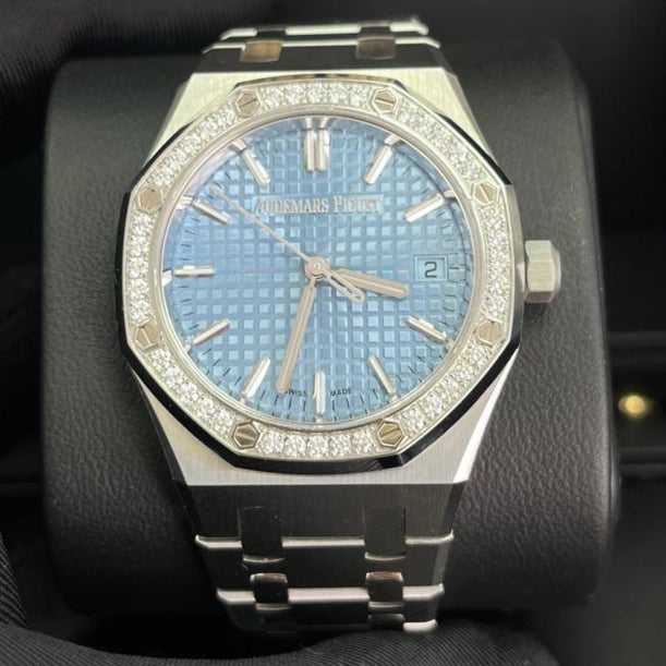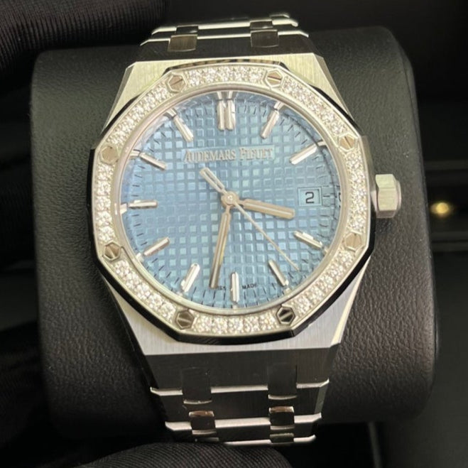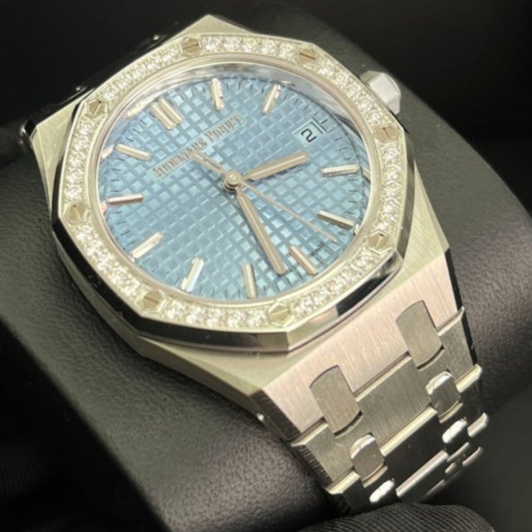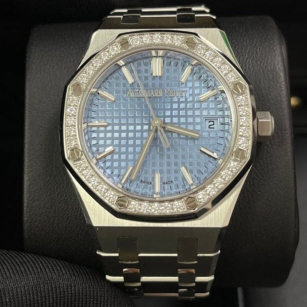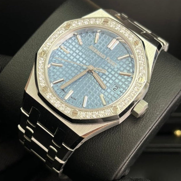 This 34 mm stainless steel selfwinding timepiece is enriched with a diamond-set bezel and a light blue "Grande Tapisserie" dial. It also incorporates the latest Royal Oak design evolution.