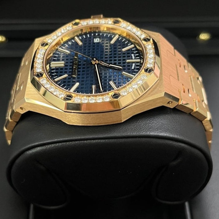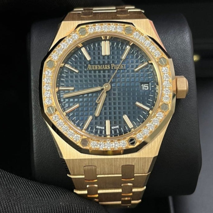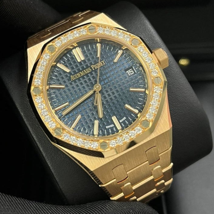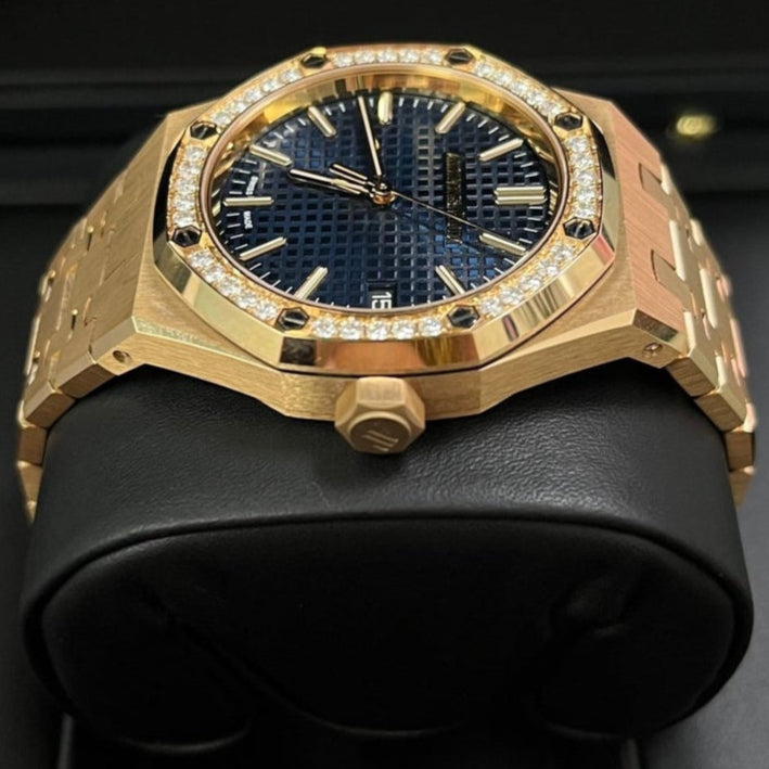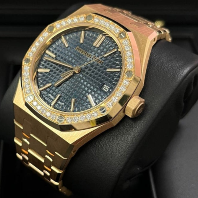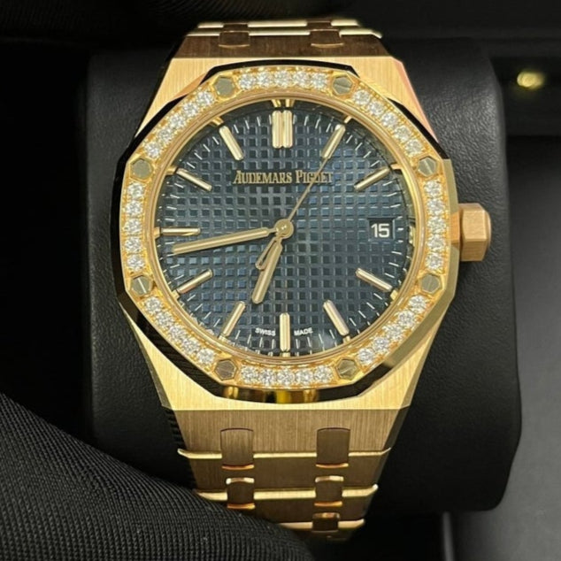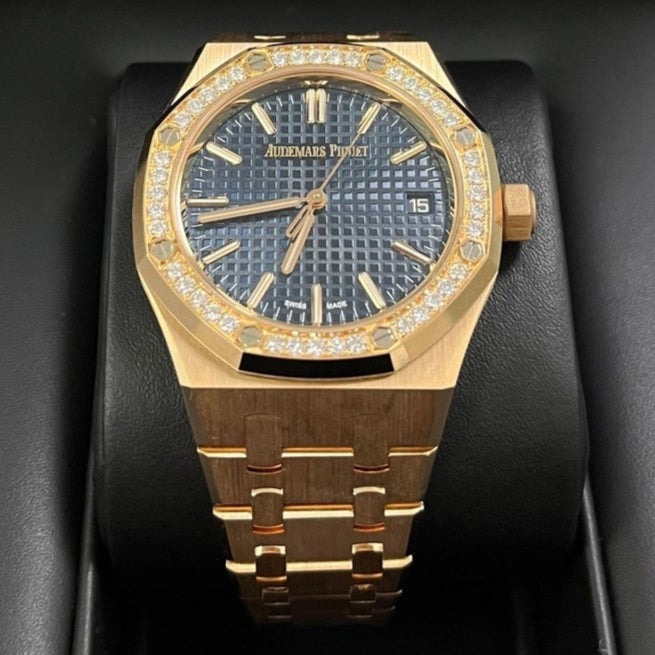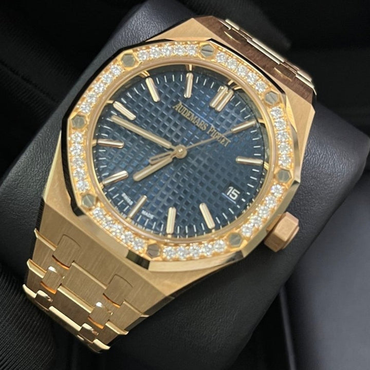 This 37 mm model benefits from the latest Royal Oak design evolution. Its 18-carat pink gold case and diamond-set bezel are contrasted with a "Bleu Nuit, Nuage 50" “Grande Tapisserie” dial, in tribute to the original Royal Oak from 1972. The sapphire caseback reveals the refined finishing of the selfwinding Calibre 5900.