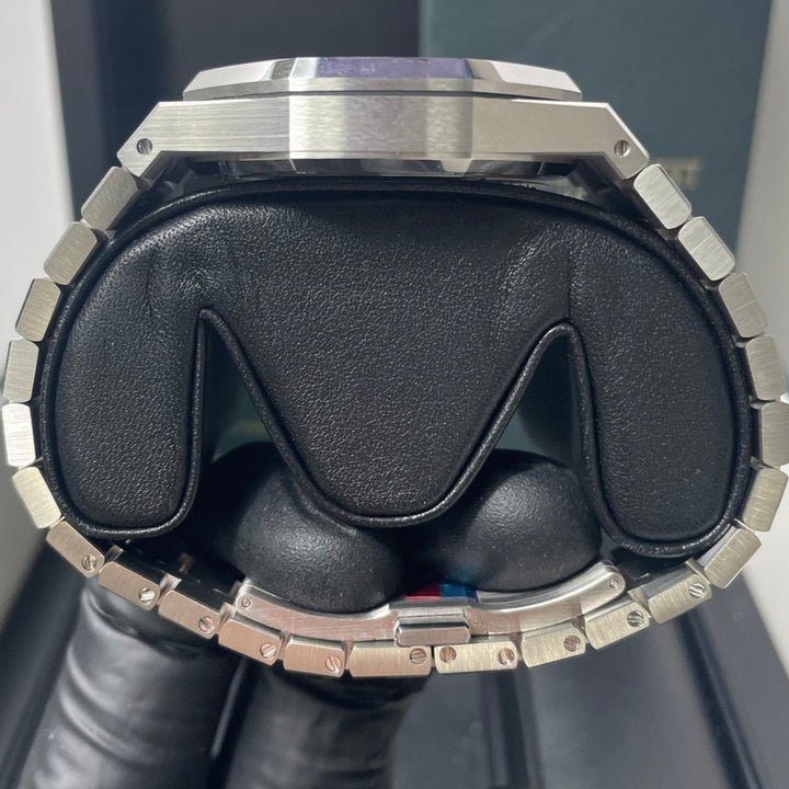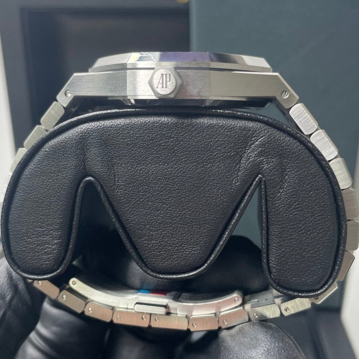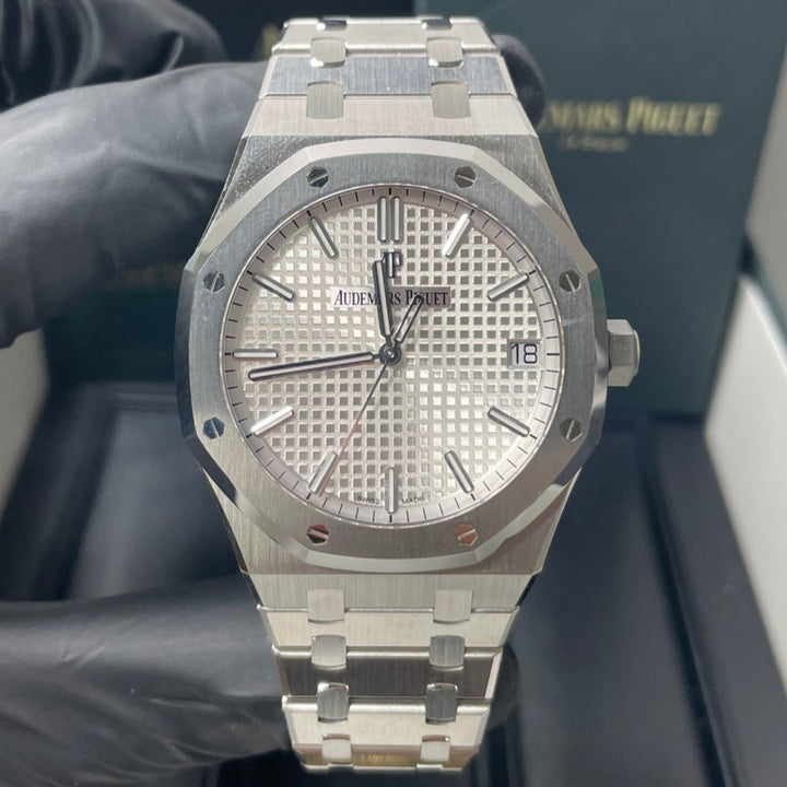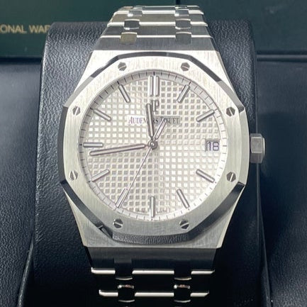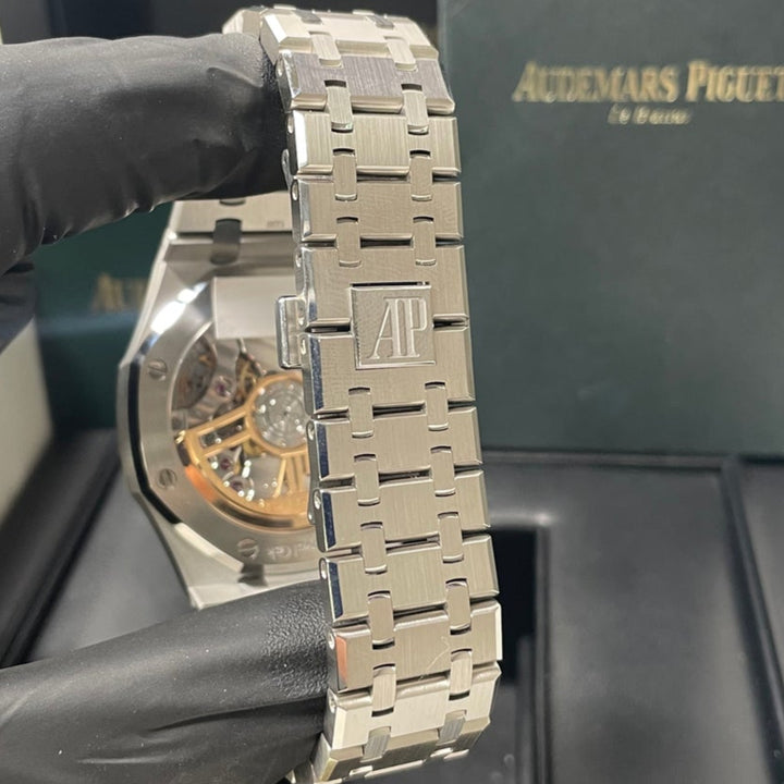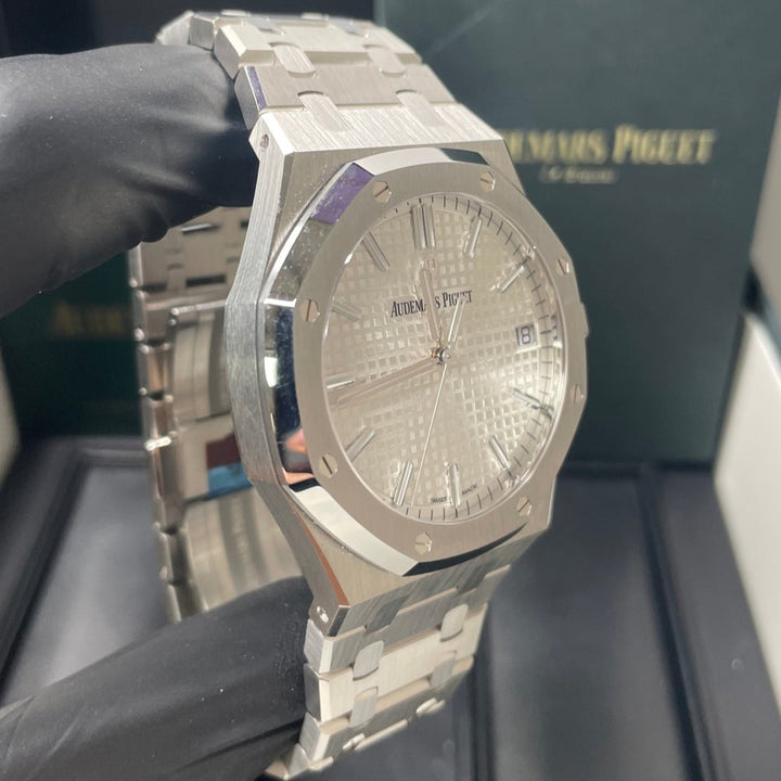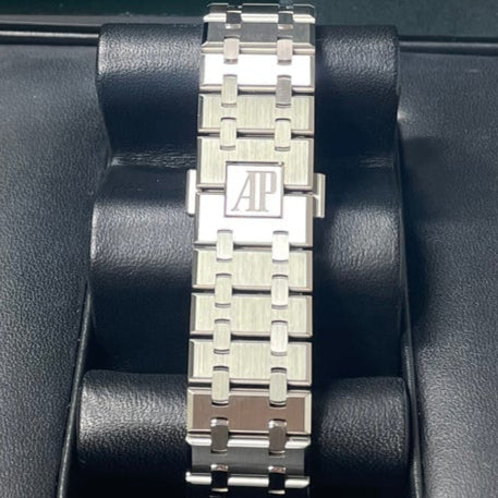 41mm stainless steel case, 10.4 mm thick, sapphire crystal back, glare-proofed sapphire crystal, slate Silver dial with Grande Tapisserie pattern, white gold applied hour-markers and Royal Oak hands with luminescent coating, Calibre 4302 self-winding movement with hours, minutes, center seconds, and date, approximately 70 hours of power reserve, stainless steel bracelet, AP folding buckle. Water-resistant up to 50 meters.