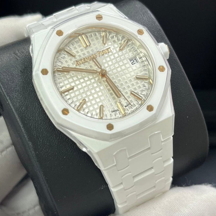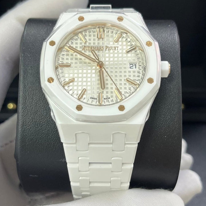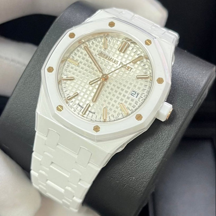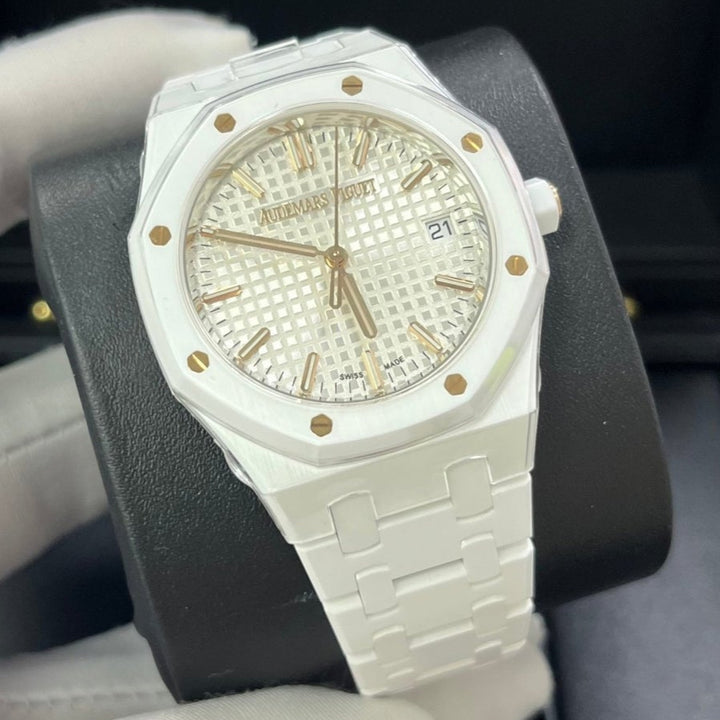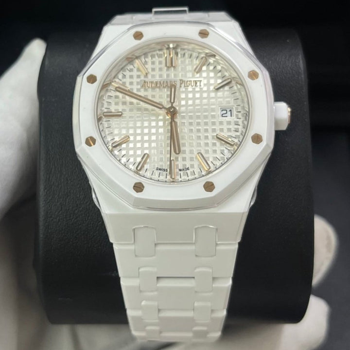 The introduction of white ceramic into this 34 mm Royal Oak, along with the addition of a silver-toned "Grande Tapisserie" dial and pink gold accent, adds a touch of glamour to this iconic timepiece. White ceramic case, glareproofed sapphire crystal and pink gold caseback. White ceramic bracelet with AP folding clasp in blackened polished steel.