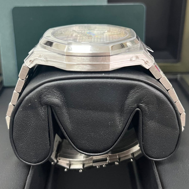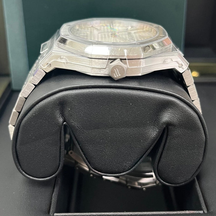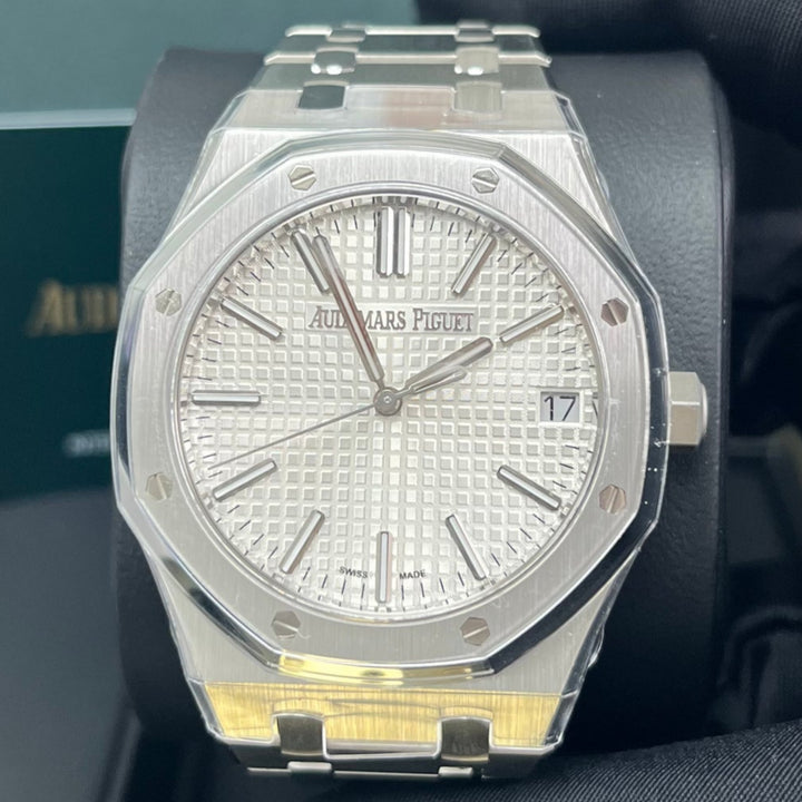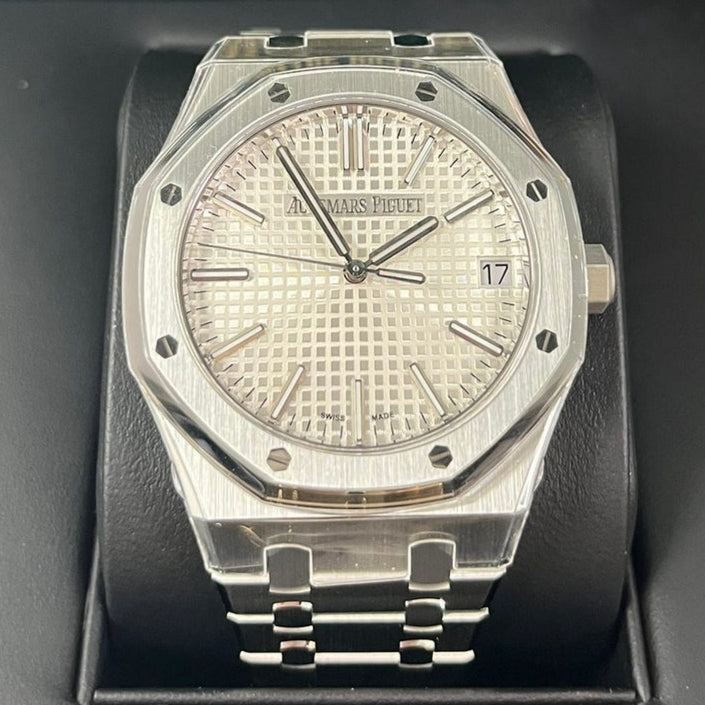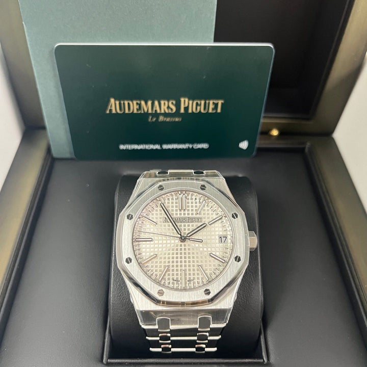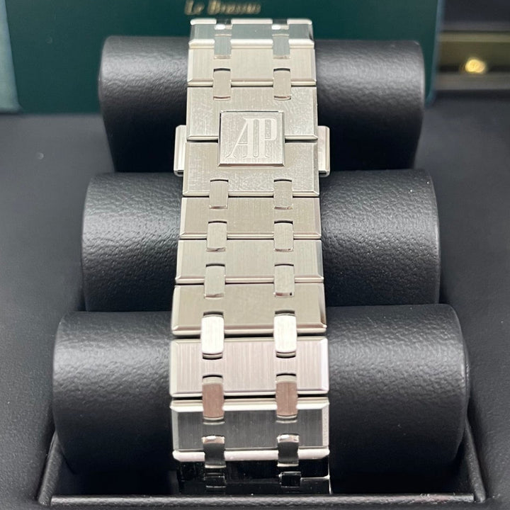 Silver-toned dial with “Grande Tapisserie” pattern, white gold applied hour-markers and Royal Oak hands with luminescent coating.