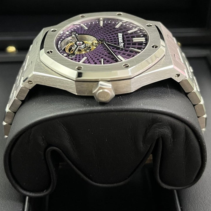 Audemars Piguet's signature “Tapisserie” design has evolved into a splendid sunburst "Evolutive" pattern. Here it is on a, new, plum-toned dial with the tourbillon taking pride of place, seen for the first time on this stainless steel watch. CASE