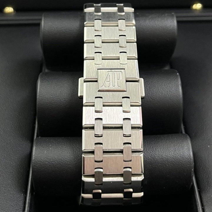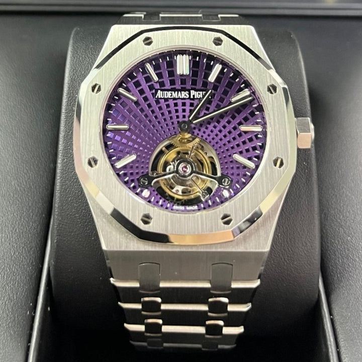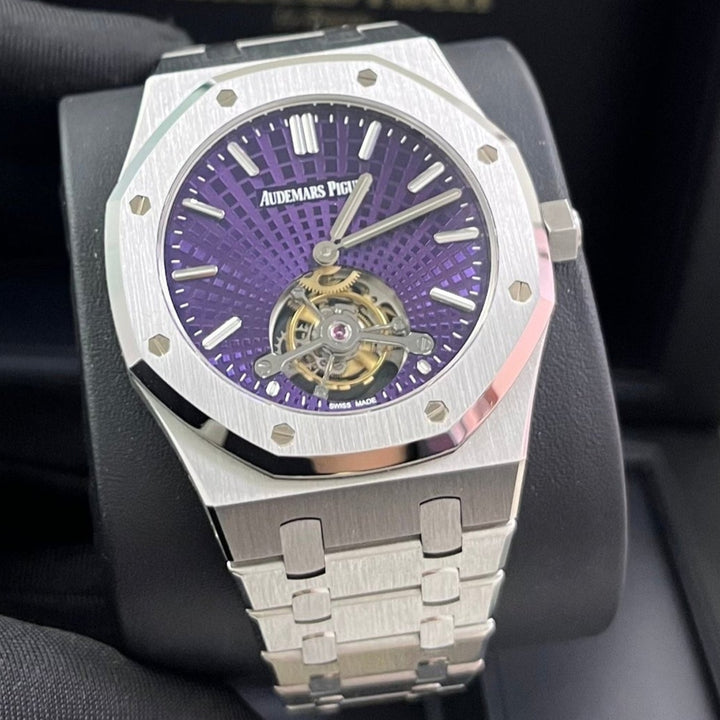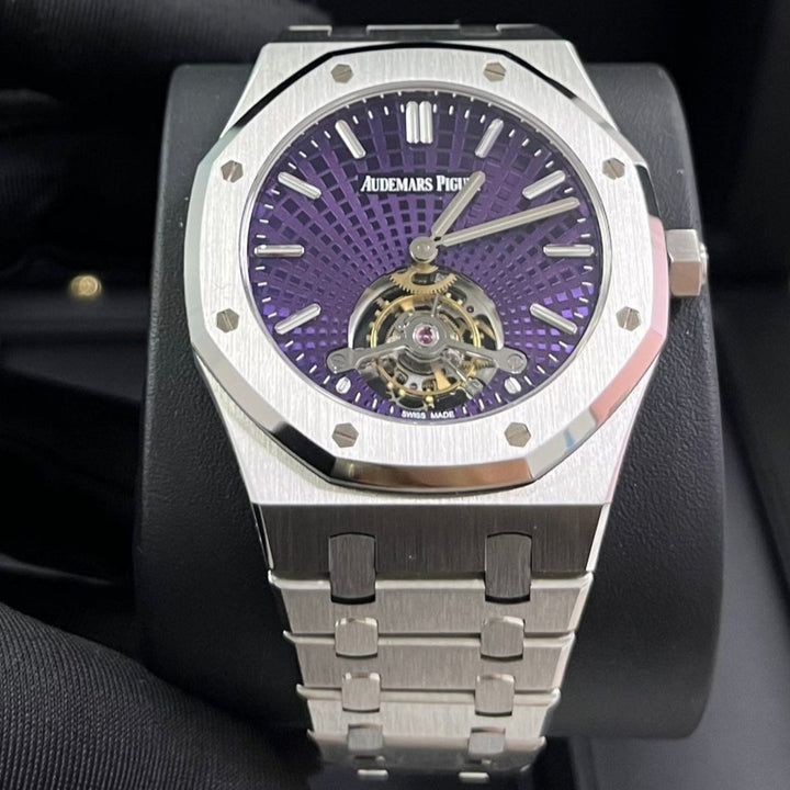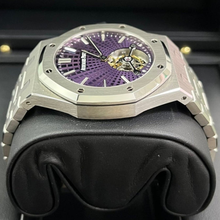 Purple dial with “Tapisserie Evolutive” pattern, white gold applied hour-markers and Royal Oak hands with luminescent coating. BRACELET