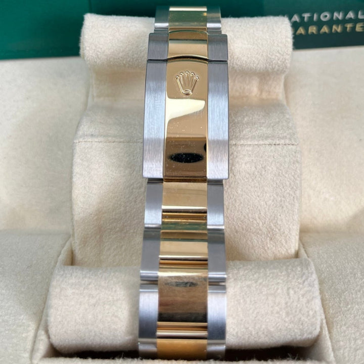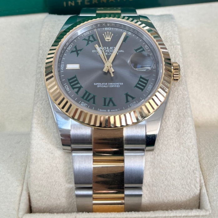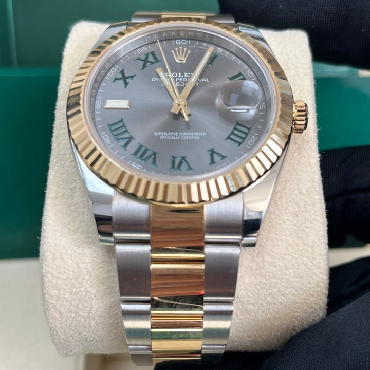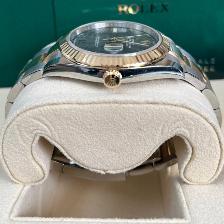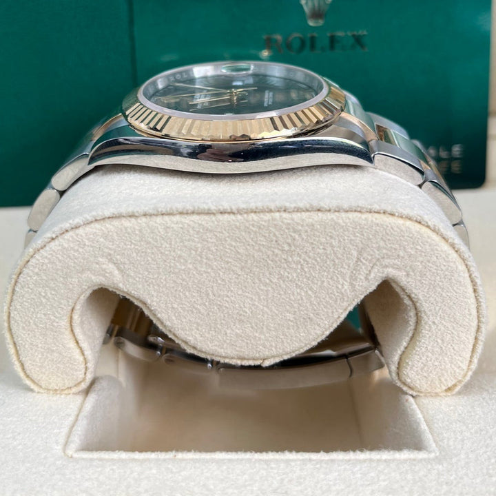 41mm Yellow Rolesor case with 904L steel monobloc middle case, screw-down steel back, 18K yellow gold screw-down crown, 18K yellow gold fluted bezel, scratch-resistant double anti-reflective sapphire crystal with cyclops lens over the date, slate dial, green Roman numerals, Rolex calibre 3235 perpetual self-winding movement with date at 3 o'clock that changes instantaneously at midnight in a few thousandths of a second, approximately 70 hours of power reserve, yellow Rolesor Oyster bracelet made from a combination of 904L steel and 18K yellow gold with flat three-piece links, folding Oysterclasp buckle with Easylink 5mm comfort extension link. Waterproof to 100 meters.